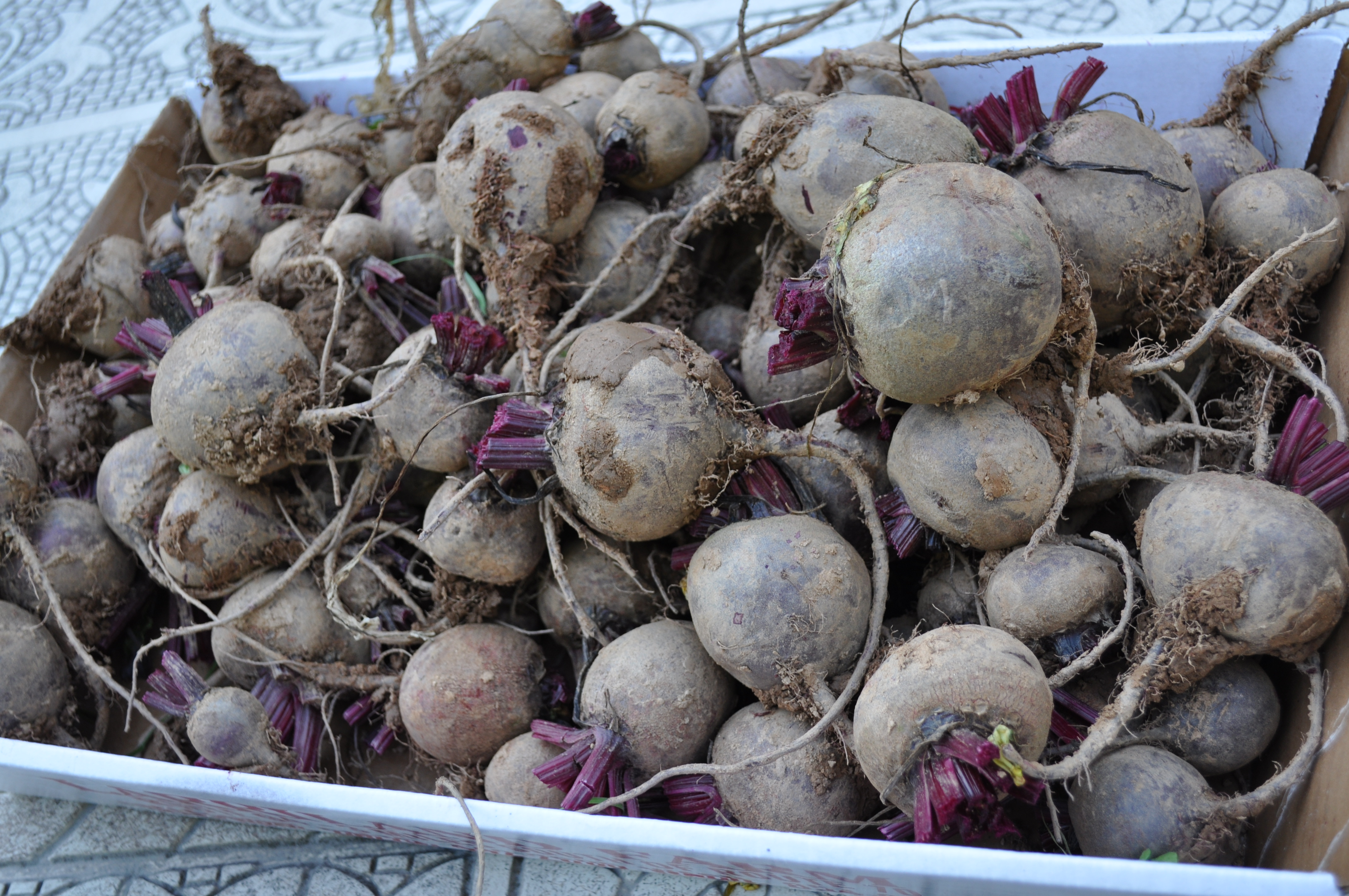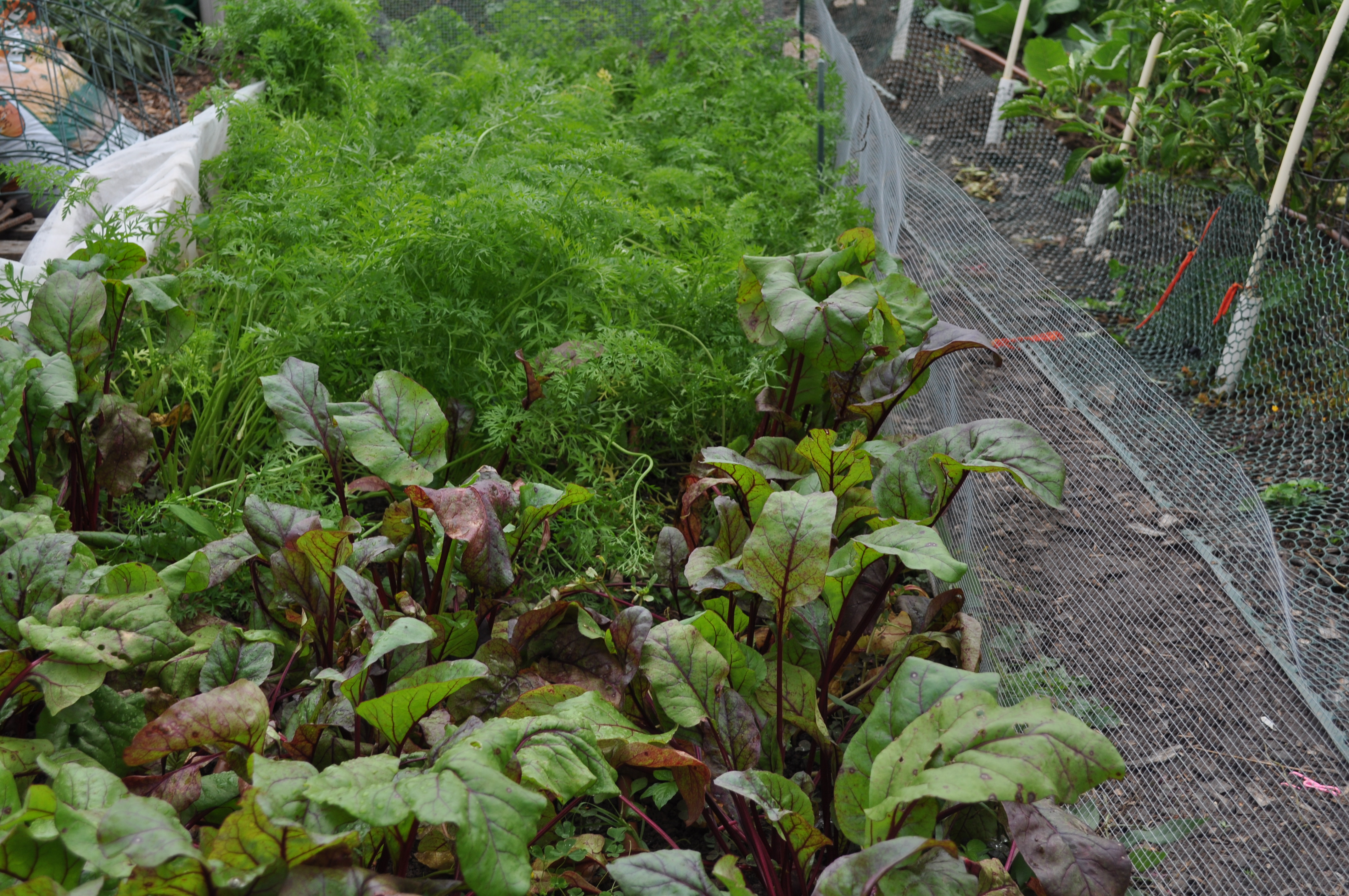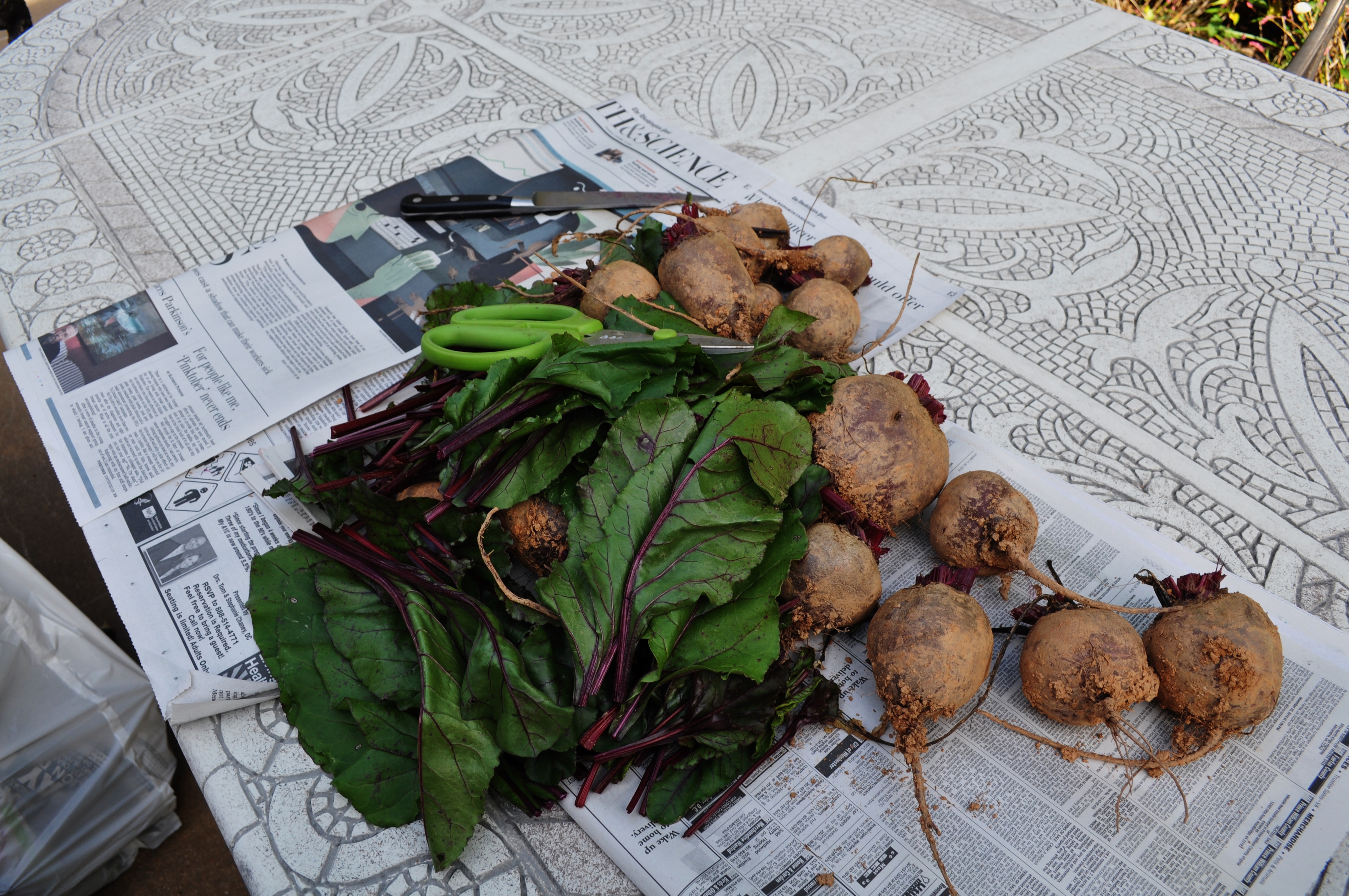 They aren’t quite ready to harvest yet, but we have been thinning them to let the rows have enough room for the plants to get larger. That means we harvest baby beets, or beet greens, or carrot tops. Beet greens and carrot tops. For those in the know, beet greens are one outstandingly good sautéed green. Particularly those little greens pulled out before the beets develop.