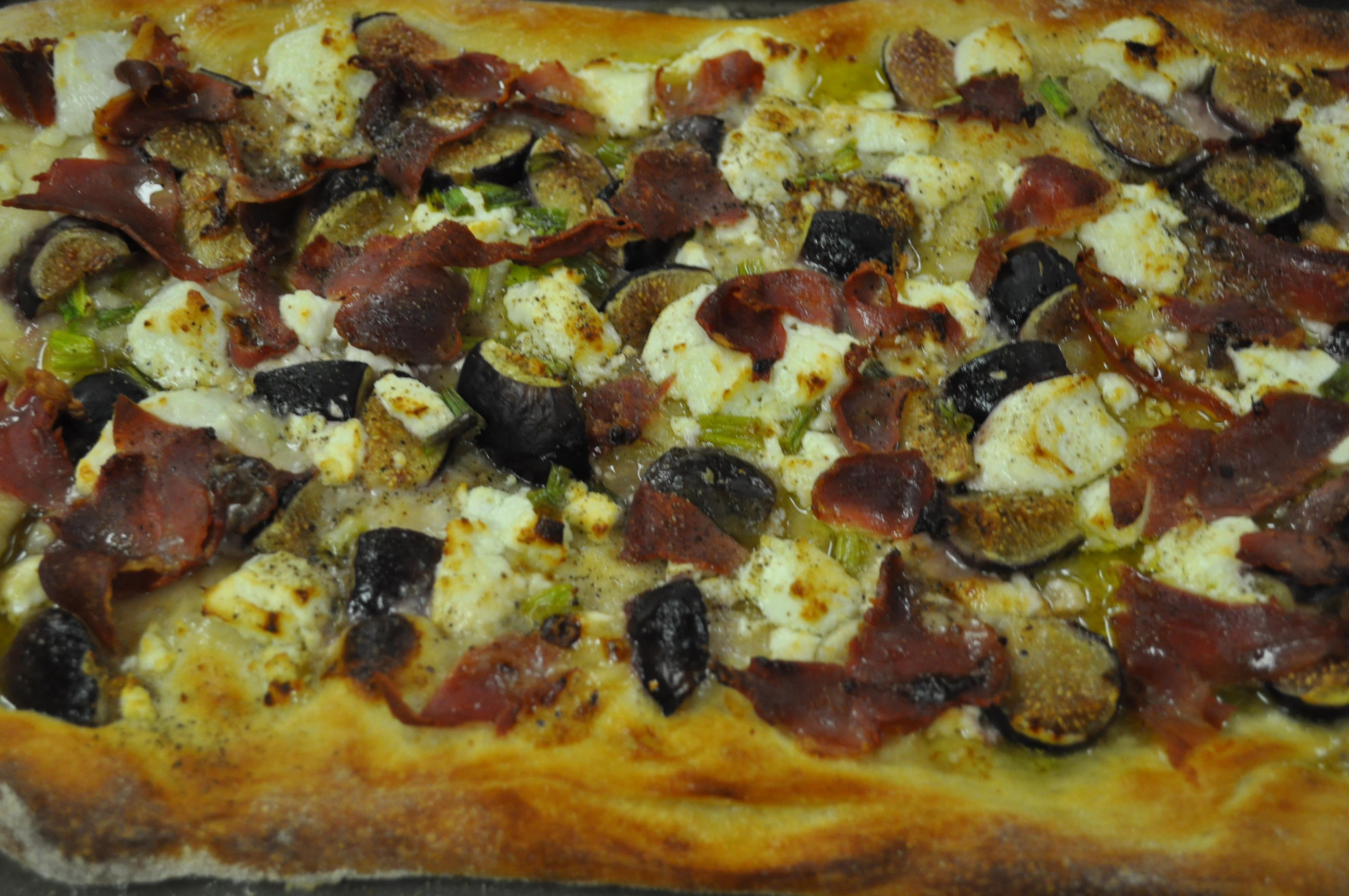 My prosciutto, goat cheese, fig, scallion and arugula pizza.