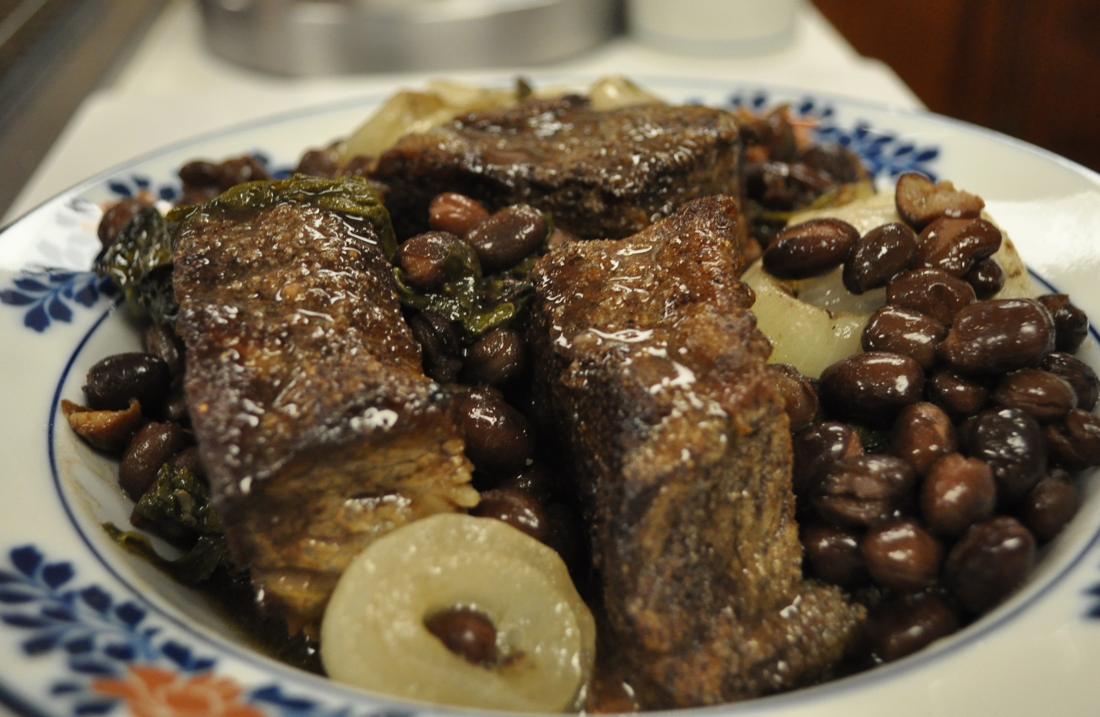This was a simple crock pot meal. Put in the pot at 1 PM on high. Dinner at 6:30. One can black beans. One onion. A large bunch of spinach. Browned ribs and some dry rub. A little salt and garlic powder.