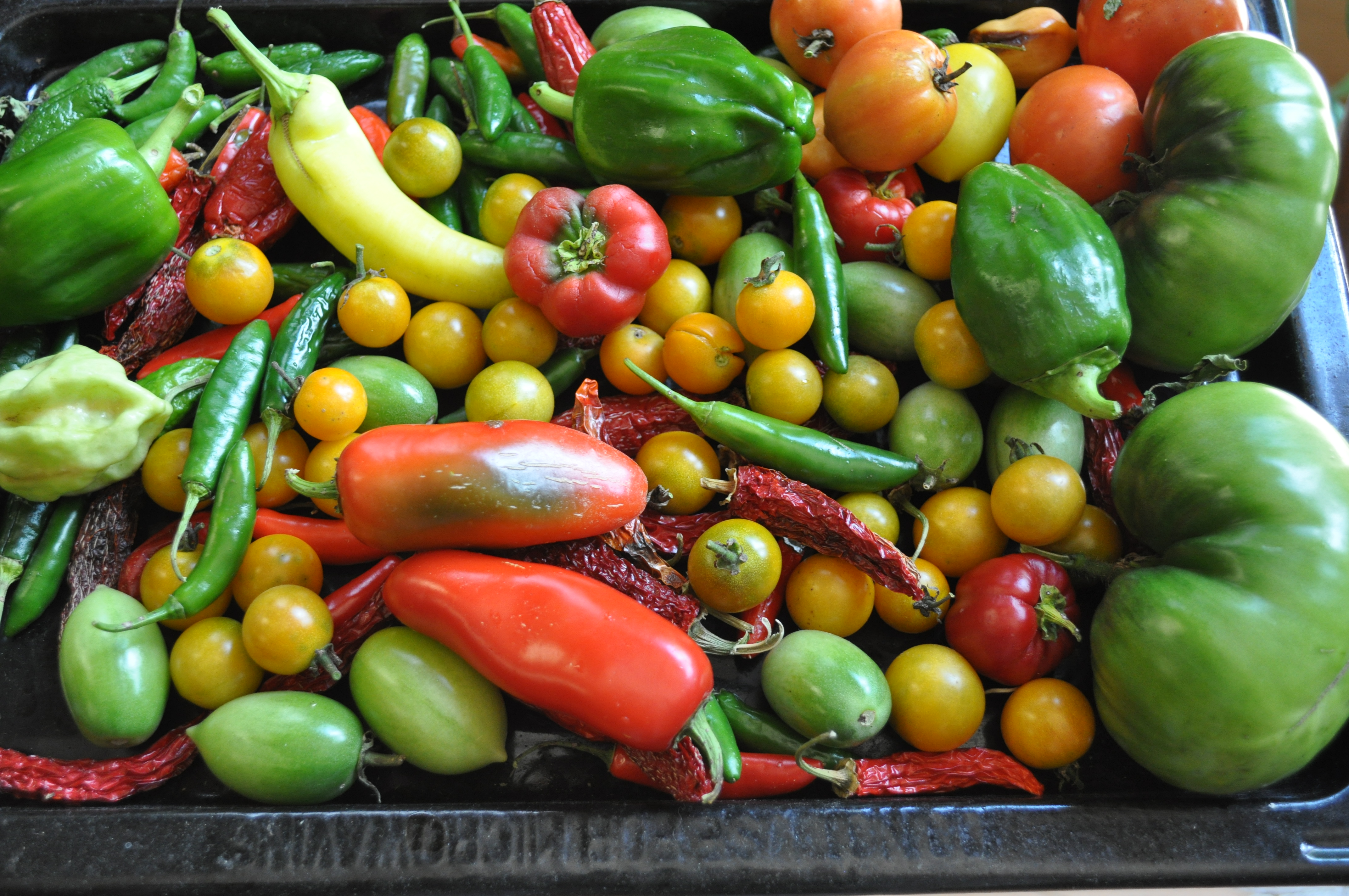 This is my “sunshine” tray. It sits by my French doors. I am still getting tomatoes and peppers to ripen. Today I also did a steam cook of peppers and onions, which went into the freezer to save for the dead of winter.