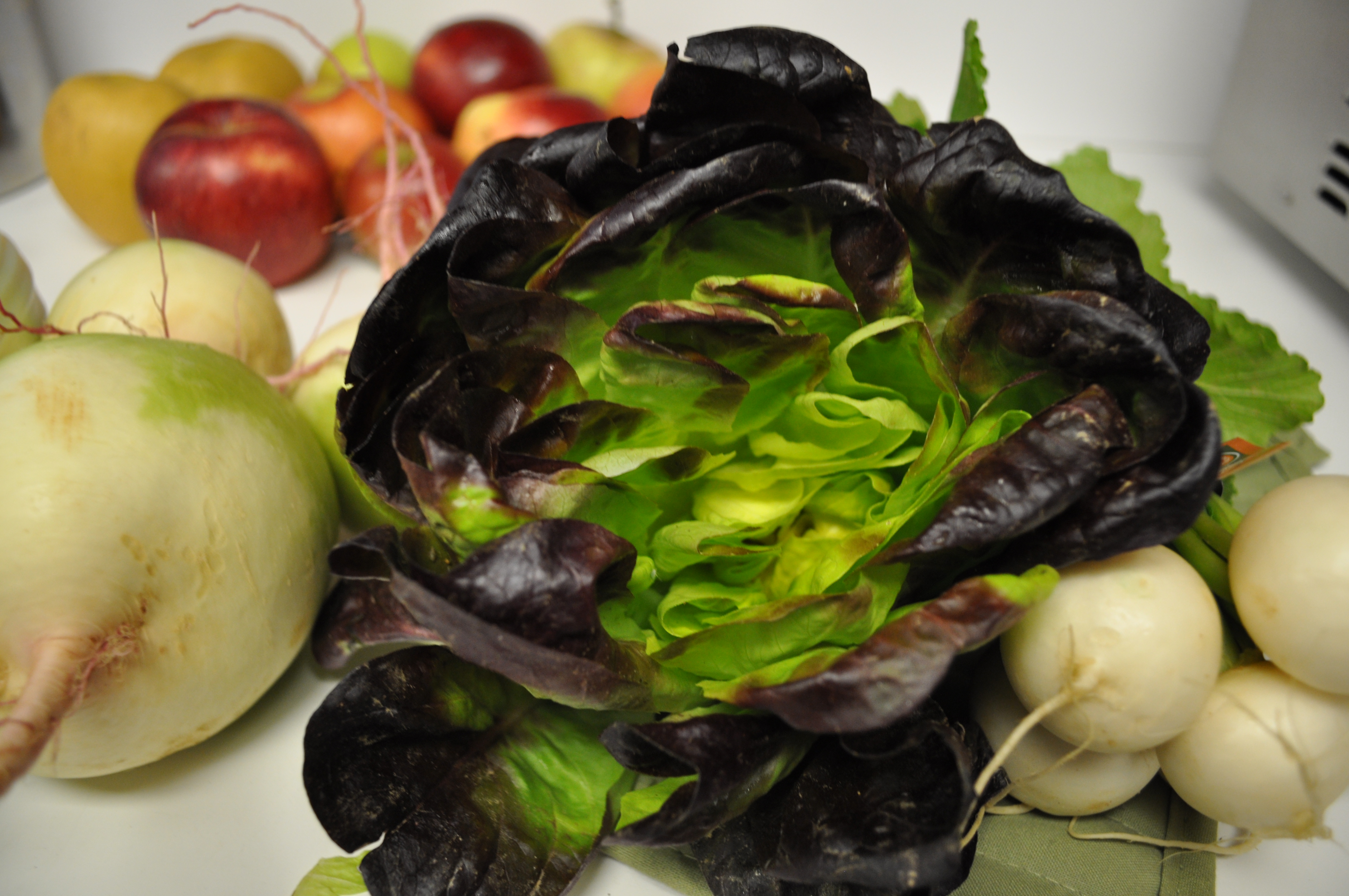 Baby Hakurei turnips. Thanks to Elizabeth at Three Beans on a String these will be honey glazed with Larriland apples and served for dinner in a few days.