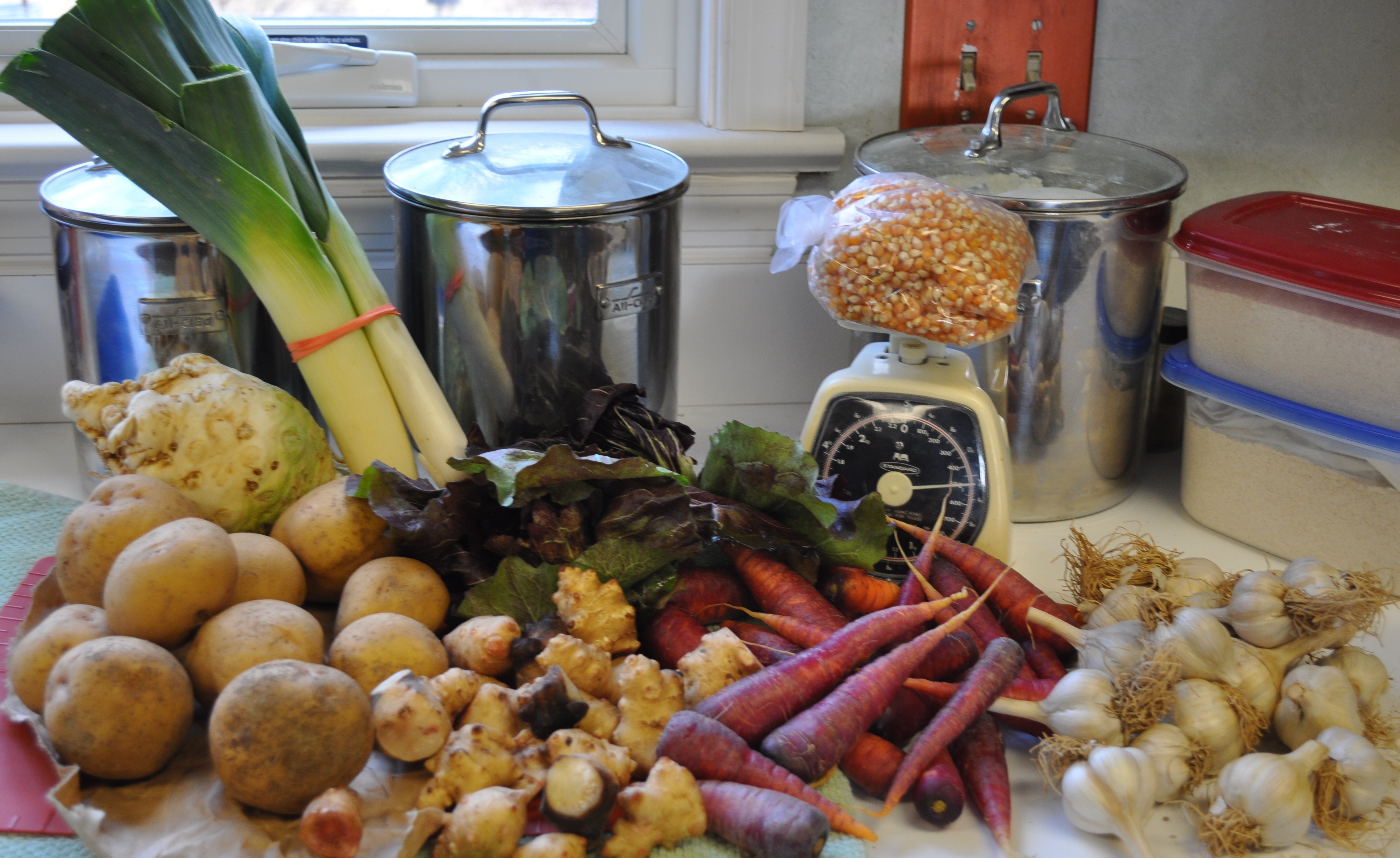 Ok, so the newsletter said “garlic”. They didn’t tell me we were getting 17 heads of organic garlic. And, the carrots. A couple of pounds of purple carrots. Plus, popcorn. Red orchid chicory. Jerusalem artichokes. Potatoes. Celeriac. And leeks.