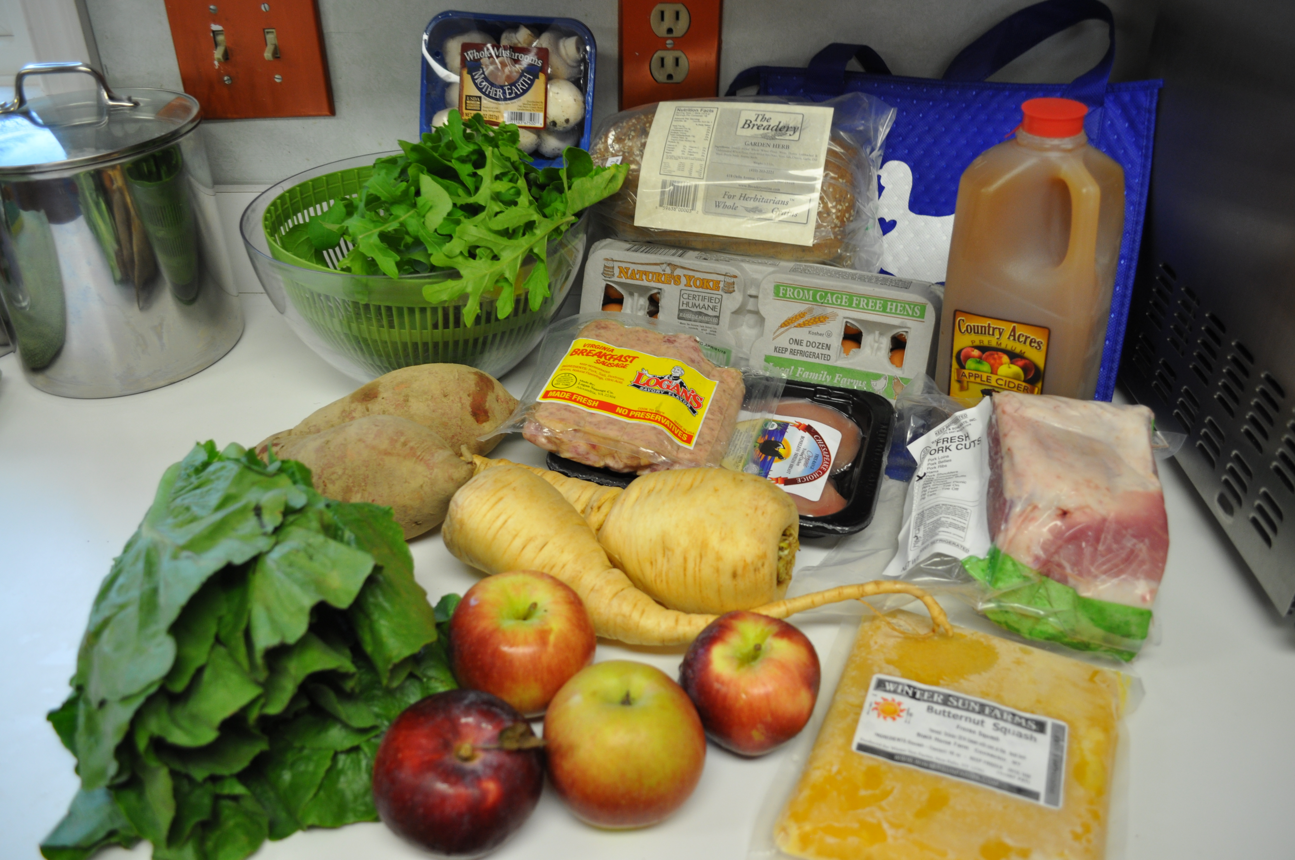 Hydroponic arugula and a head of romaine. There were also parsnips, apples, mushrooms, sweet potatoes (really? Do you know how many types of sweet potatoes are hanging out in my pantry?), butternut squash puree. My apple cider for milk substitute to use to make that beautiful bone-in pork roast. A couple of chicken breasts. Destined to become chicken salad. Eggs. Bread. Breakfast links.