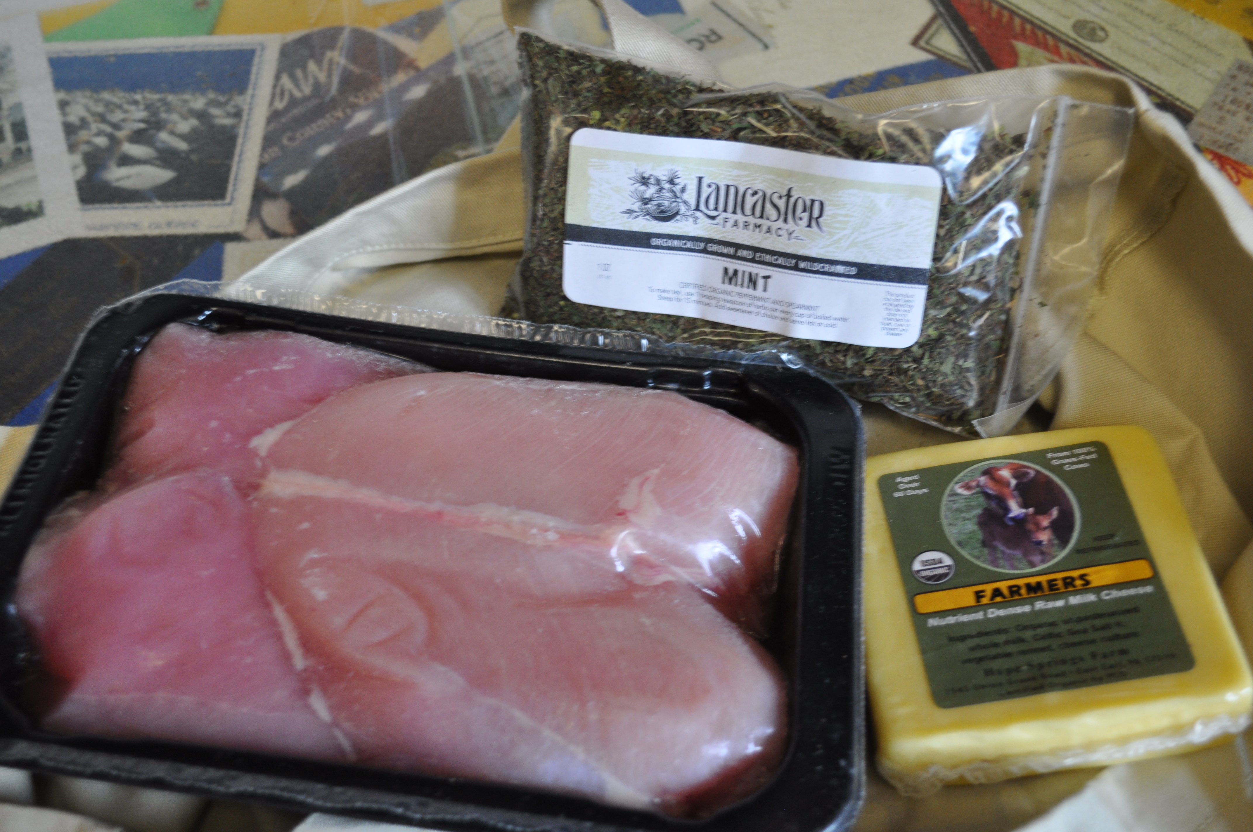 The pantry item was mint tea. The cheese was a raw milk farmer’s cheese. The meat share was 1 1/2 pounds of boneless skinless chicken breast.
