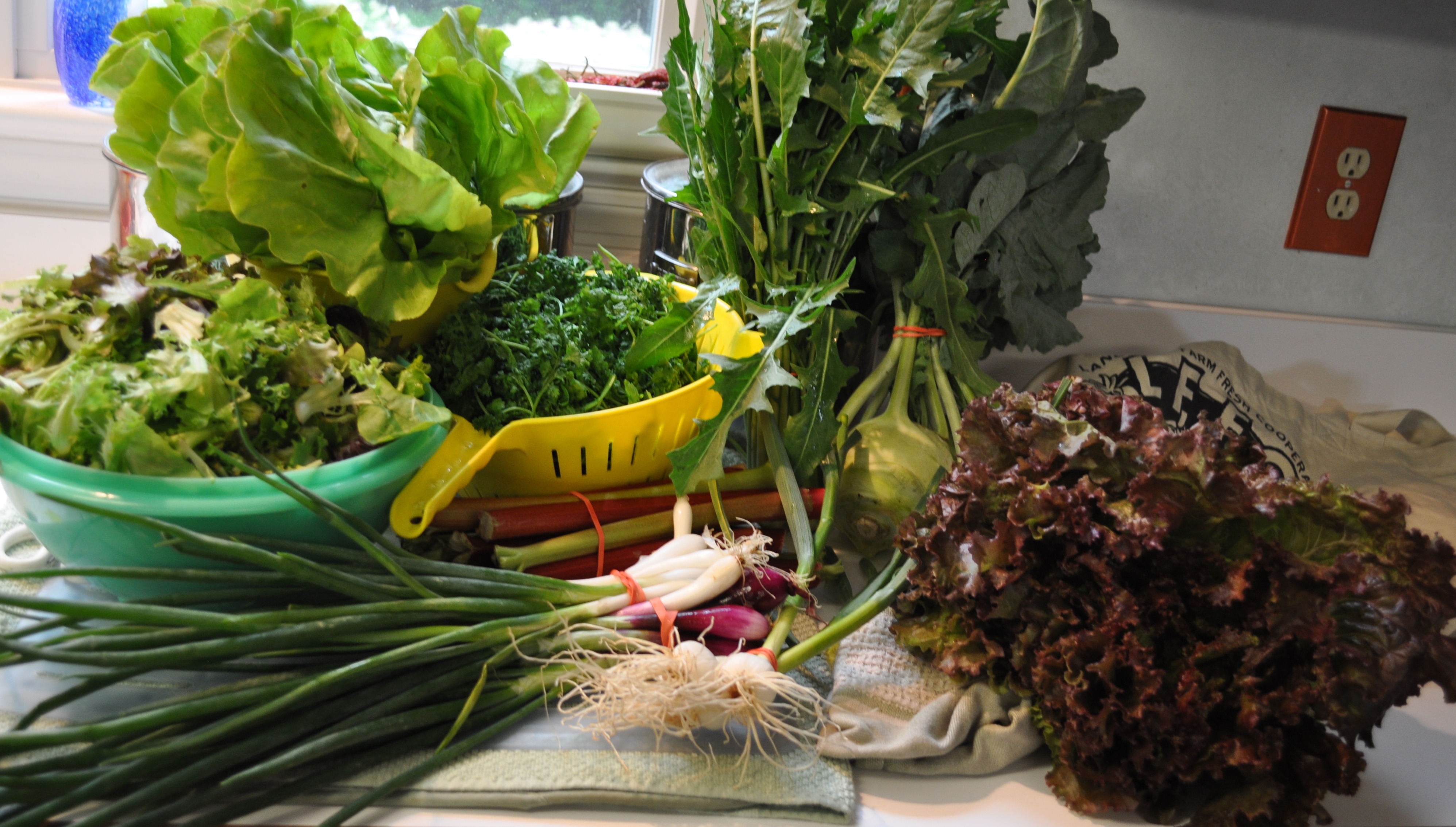 There were white kohlrabi. Red and white scallions. Green garlic. Another POUND of spring mix. Red leaf lettuce. Green butterhead lettuce. Rhubarb. Galantina chicory. Baby crinkled cress.