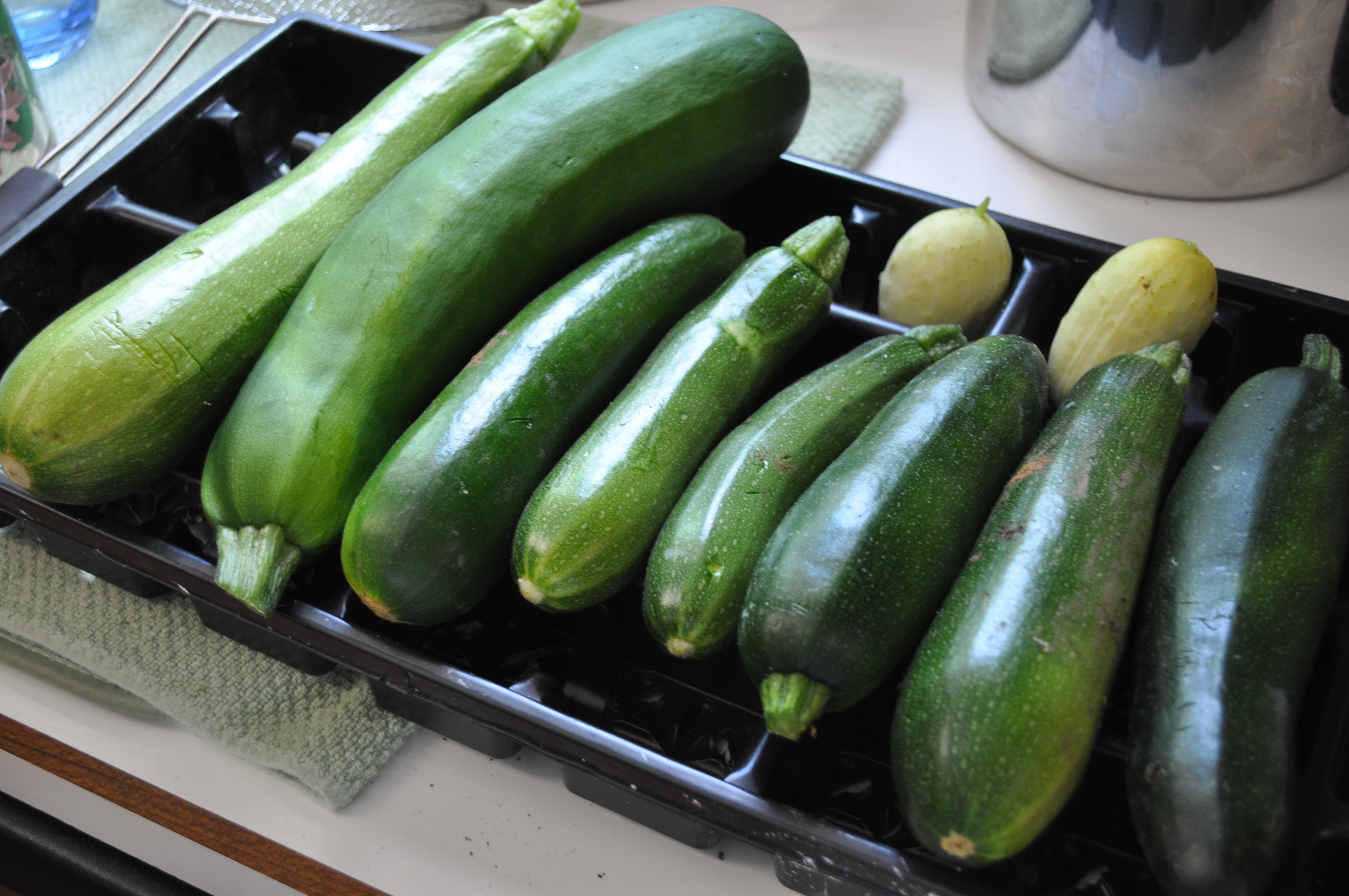 The zucchini are officially out of control already, less than a week after finding the first few. The behemoth in the picture weighed 24 ounces and was hiding (the usual ploy of zucchini not wanting to be harvested). All told. 84 ounces in 8 zucchini. And, this is just the beginning.