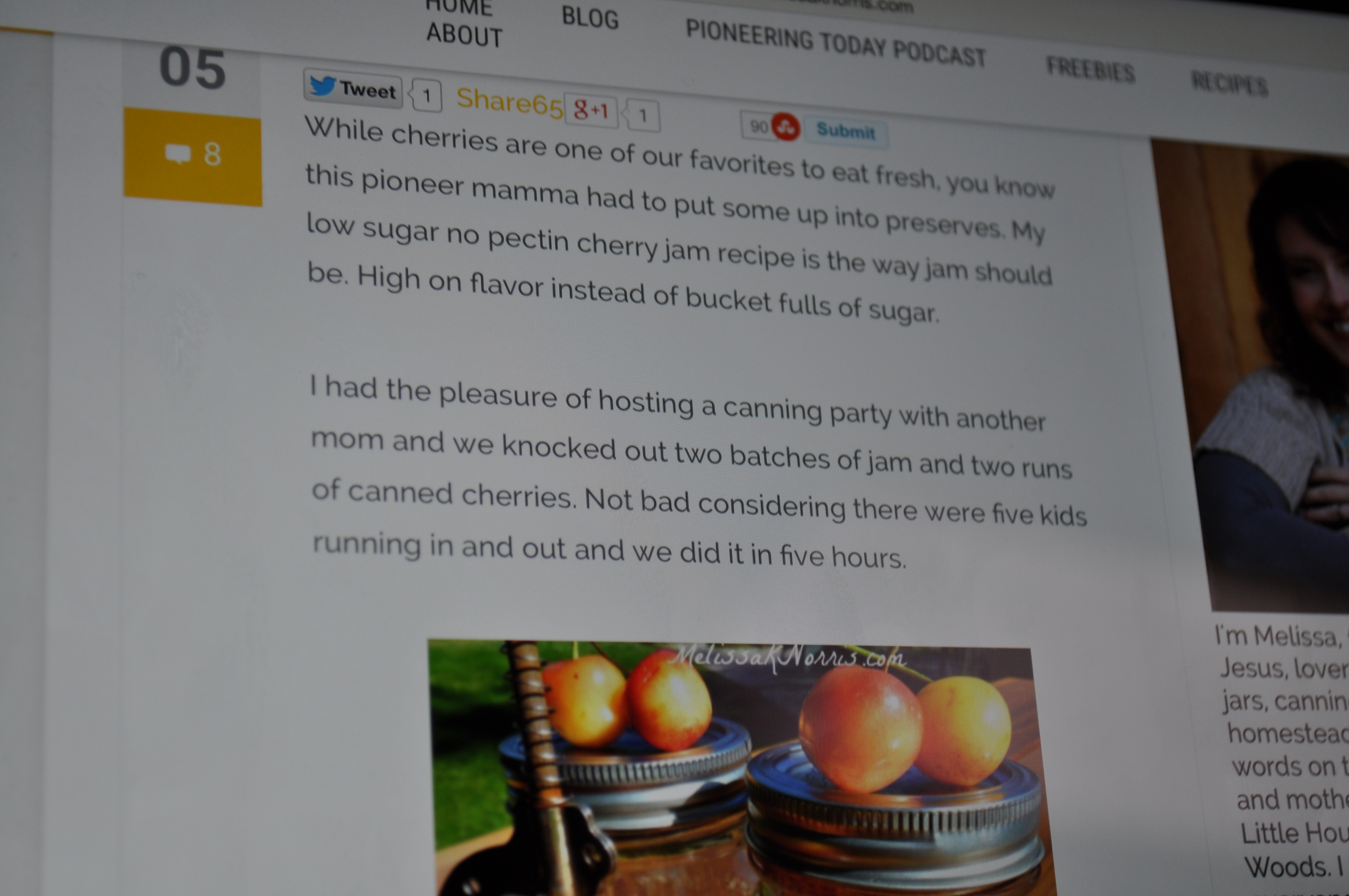 The recipe was a low sugar, no pectin, three ingredient one. Cherries. Sugar. Lemon juice. Not too hard to do.