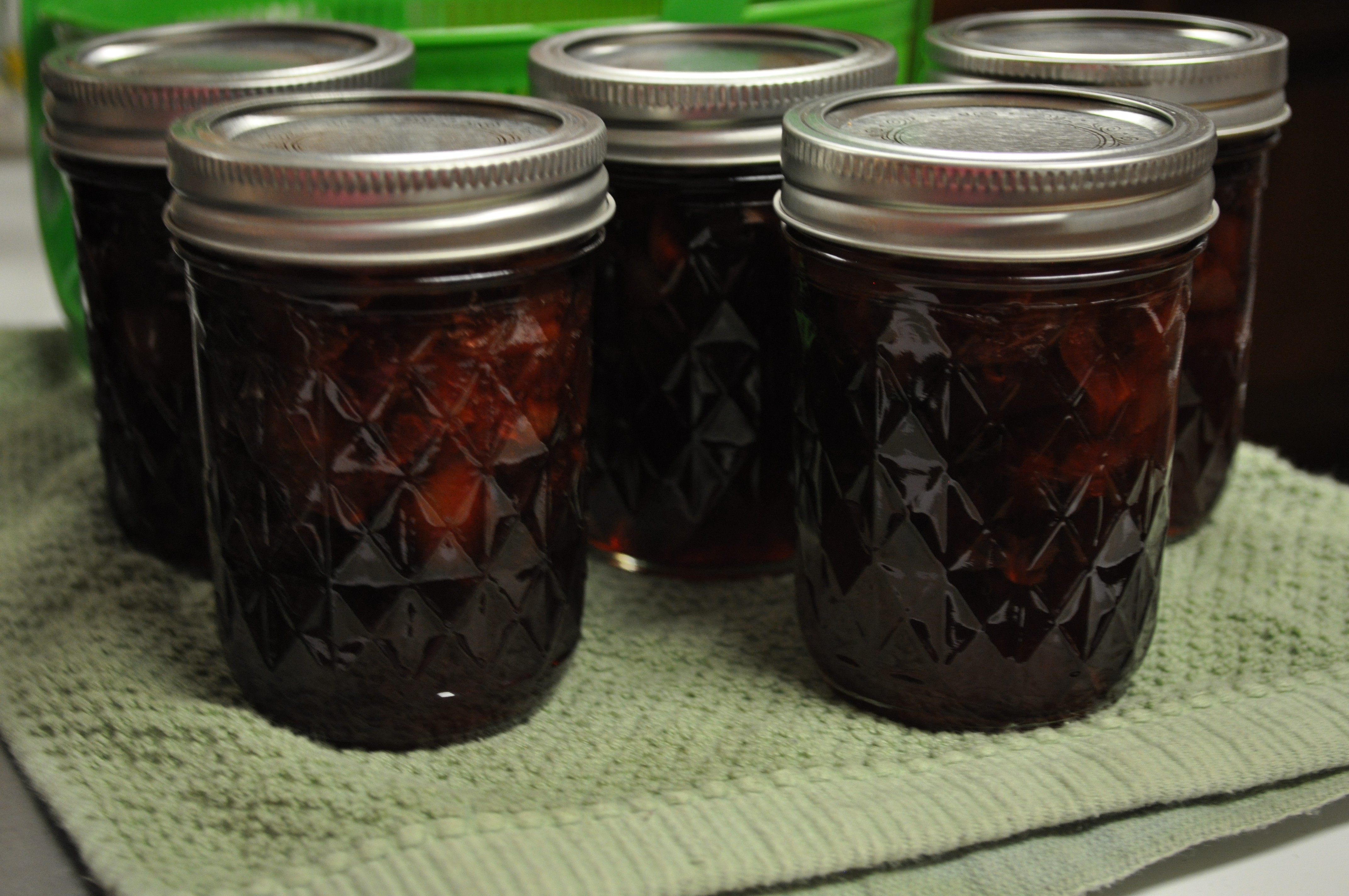 I came home, cleaned and pitted them. Prepared my canning stuff. Found a recipe I liked. And made five jars of cherry “jam”, which is actually more like a syrup.