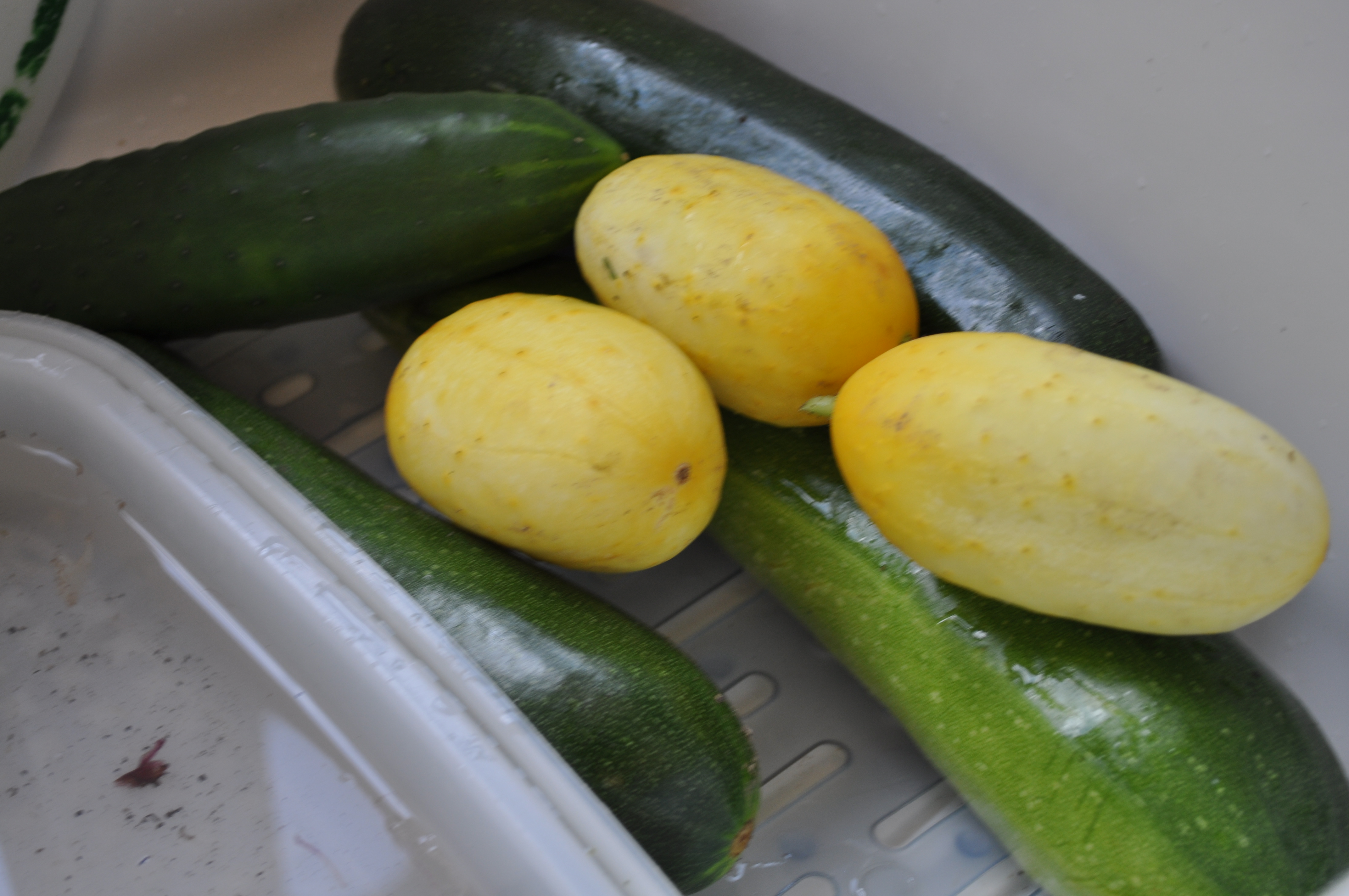 I harvested my first green cucumber this weekend. Plus, three more mini whites.