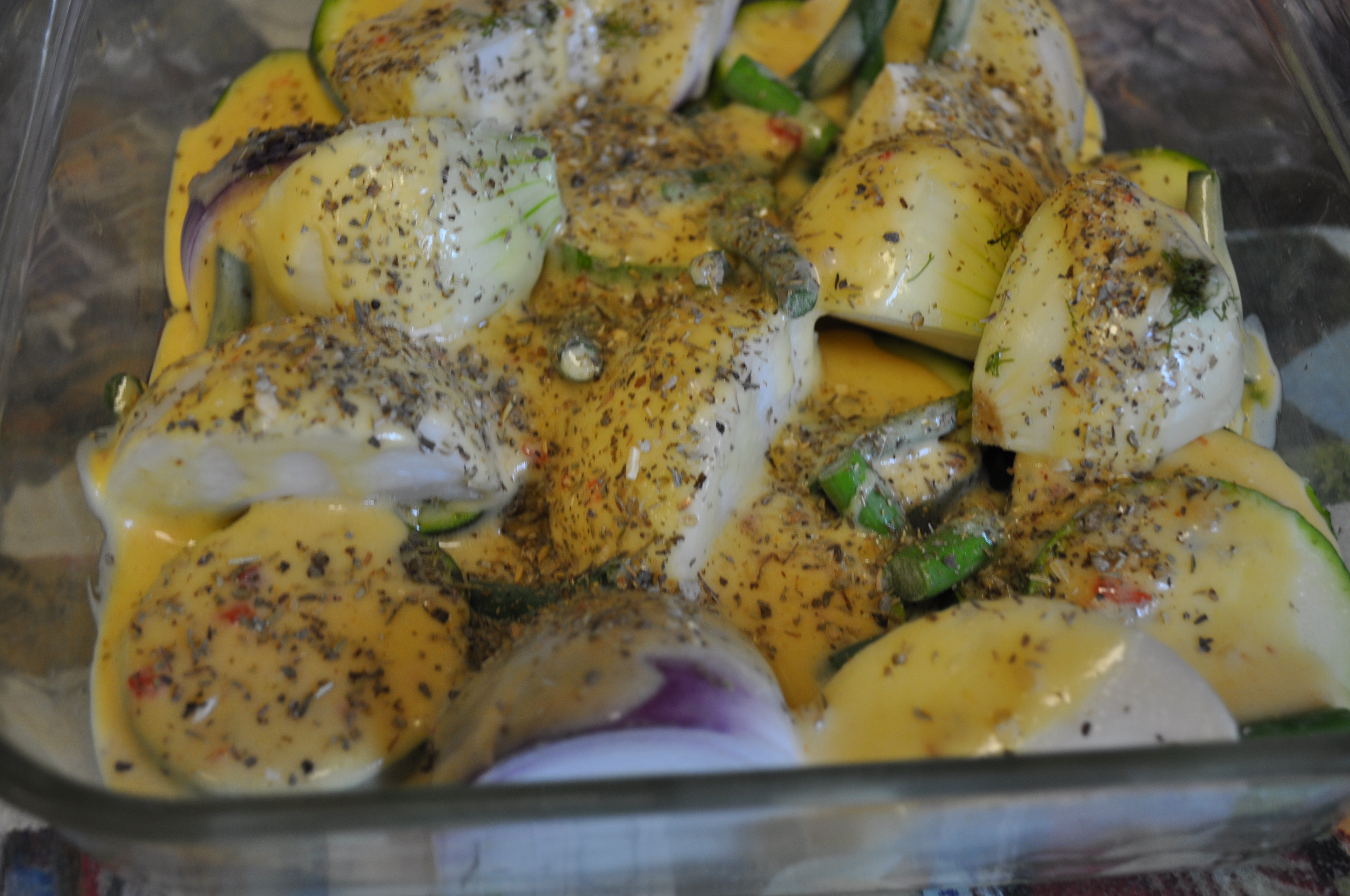 Only I jazzed them up with zucchini and garlic scapes. A simple vinaigrette made with honey mustard, olive oil, thyme, dill, salt, pepper and lemon juice. Baked until soft.