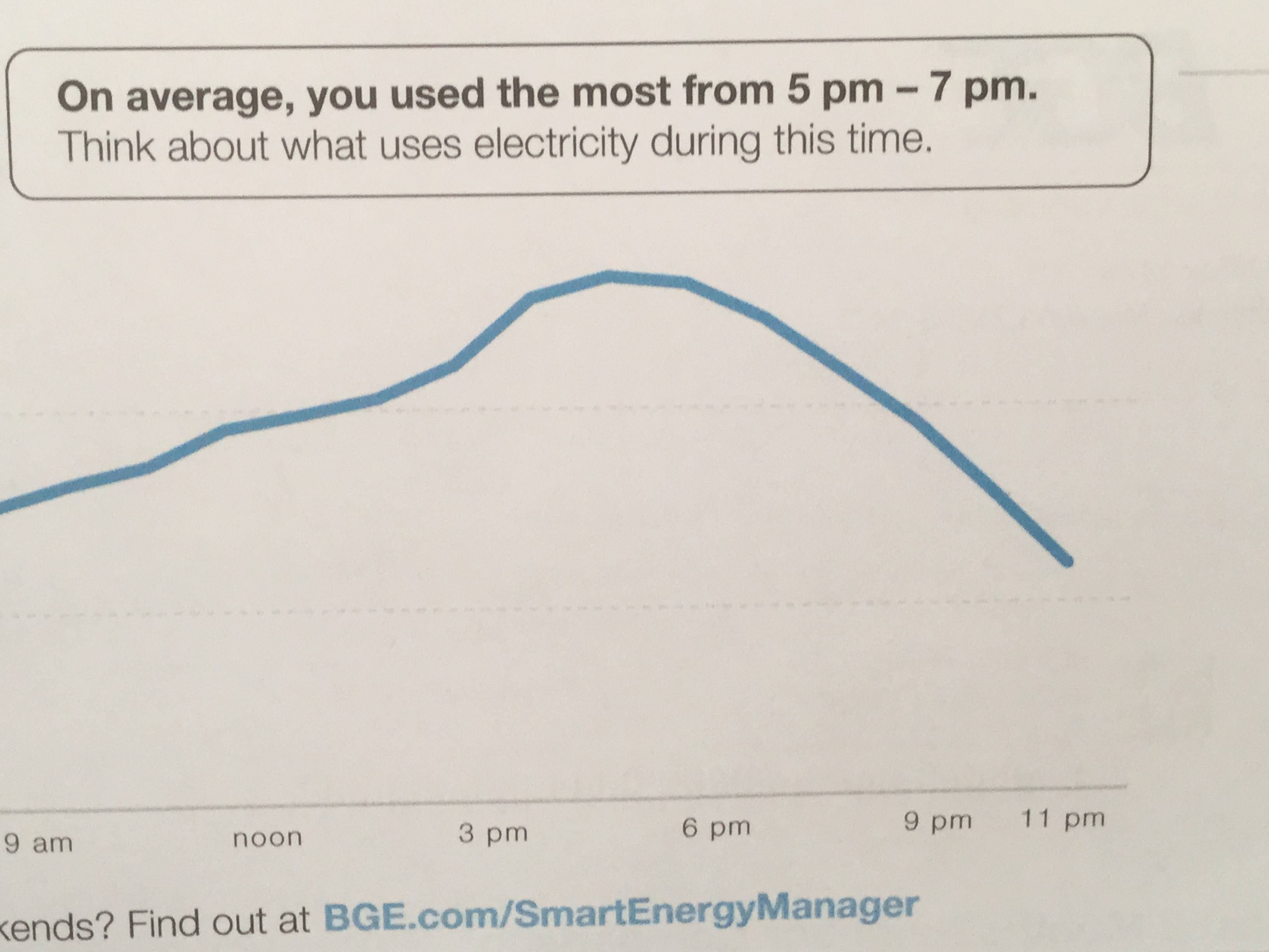 4. I don’t like those reports either – it’s like BGE is making it it’s business to make us all feel guilty. Which doesn’t make sense, because if we use more energy, they make more money. It’s kind of like McDonald’s pretending to want to give us healthy food, when what they REALLY want is for us to remain addicted to the junky stuff.