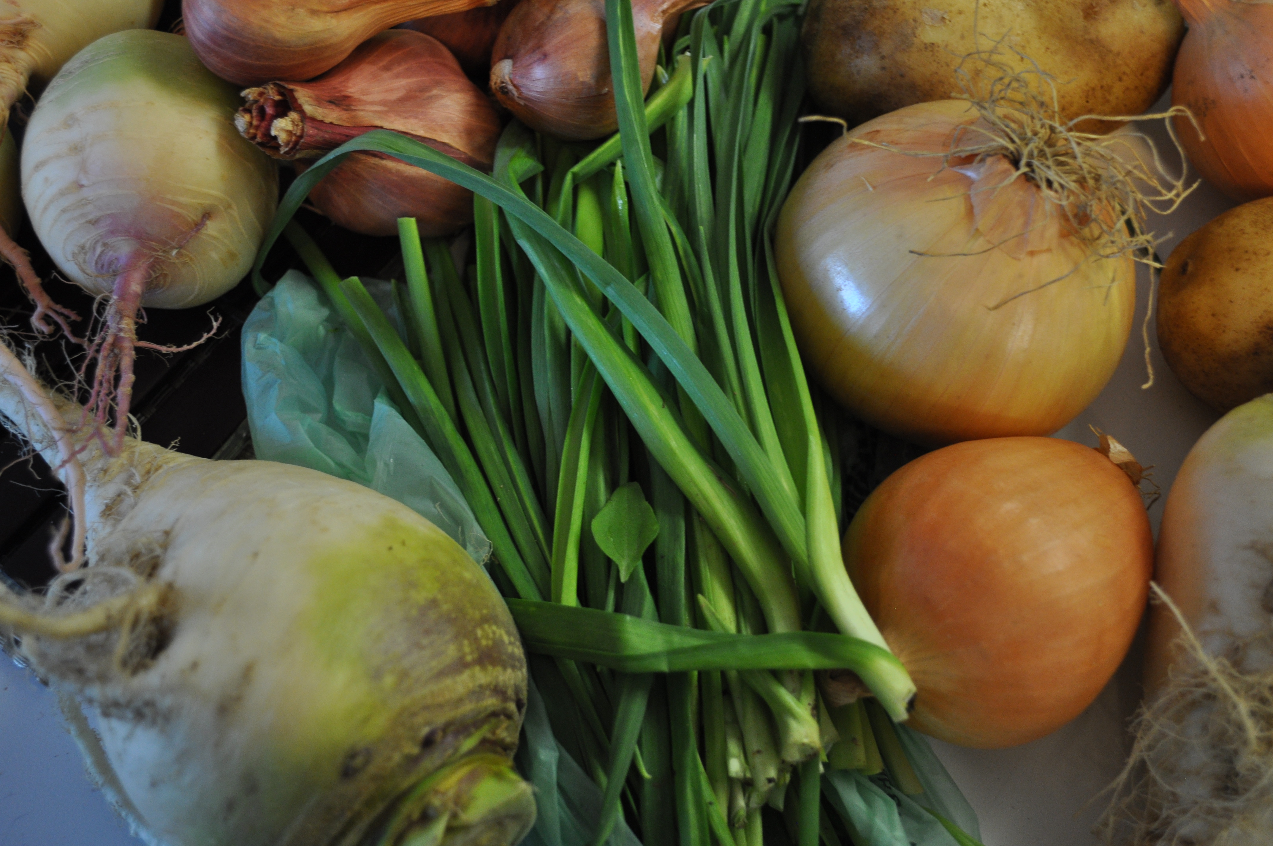 That would be the garlic greens aka spring garlic that was in last week’s CSA box. Obviously the fall plantings are taking off in all this warm weather. Besides the garlic we have been getting lots of greens. Usually they are done by this time of year.