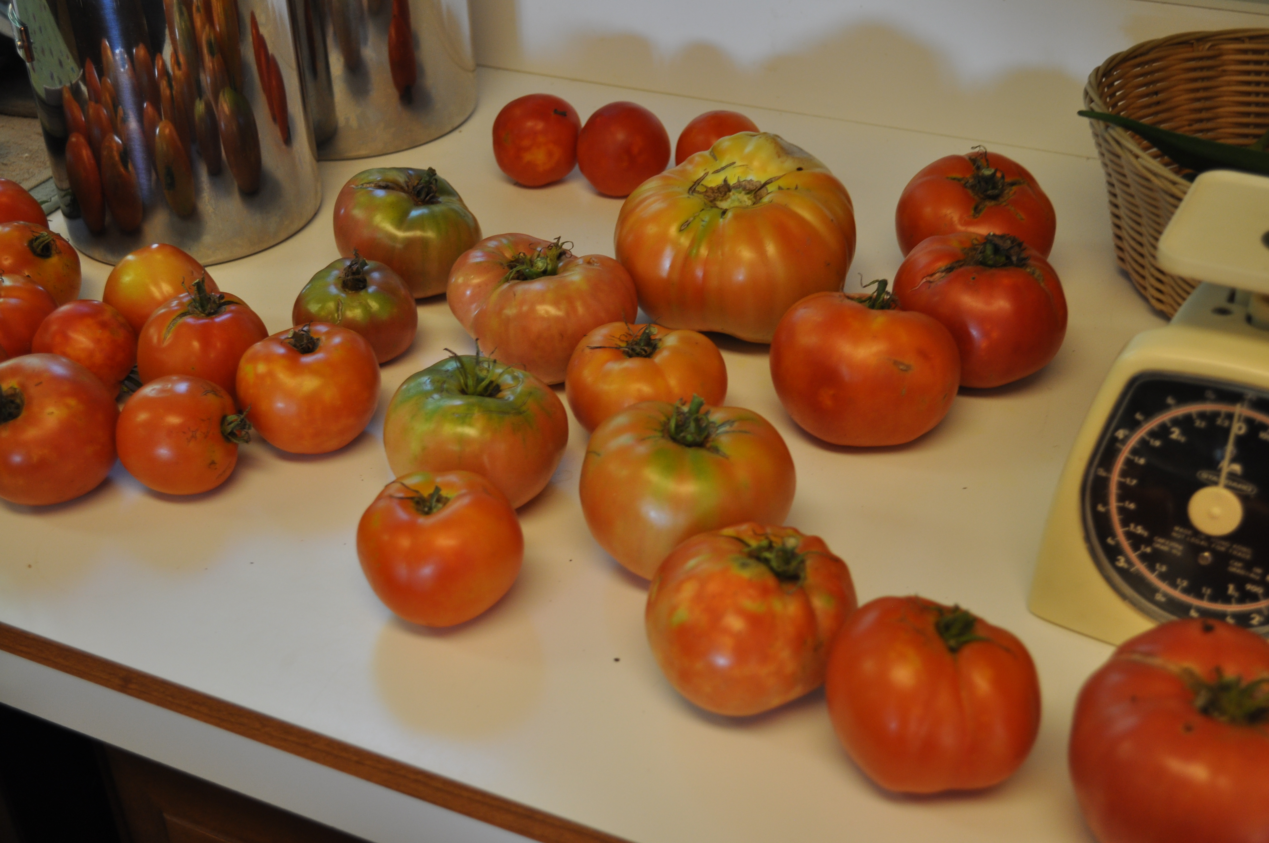 This year I concentrated on heirlooms. Which didn’t do very well, but I did make it to the century mark. 100 pounds of tomatoes by last Tuesday. With a few pounds of green tomatoes still hanging out there. Third year in a row to pass the century mark.