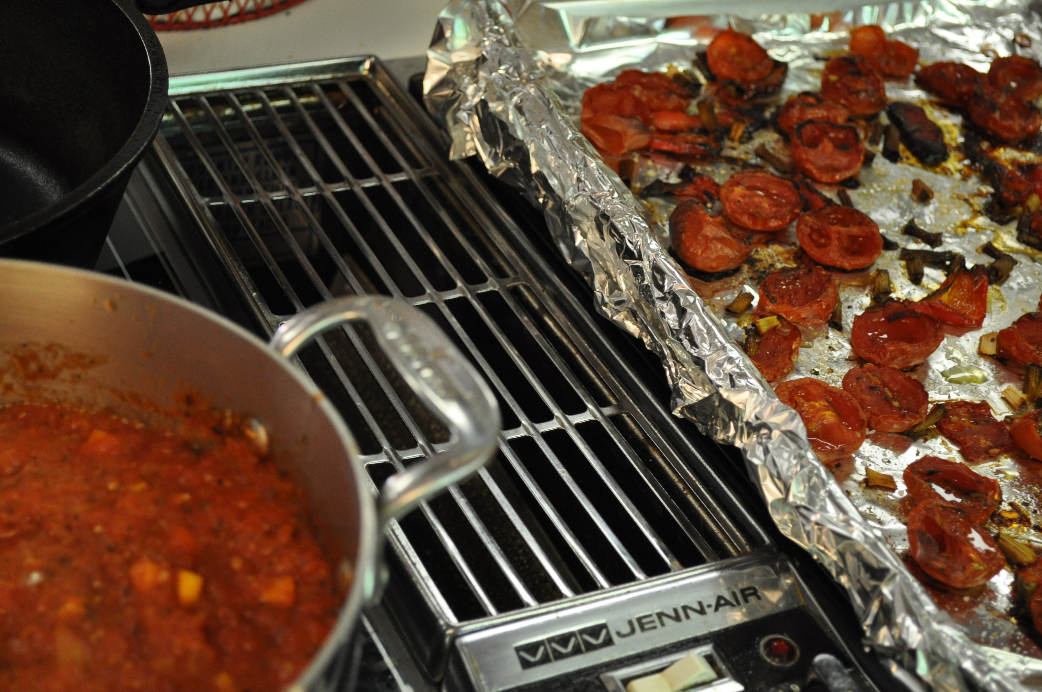 A tray from the oven, and a finished sauce. My sauce is simple. Just add a pinch of sugar, some salt and pepper and oregano. I like it chunky. Like this.
