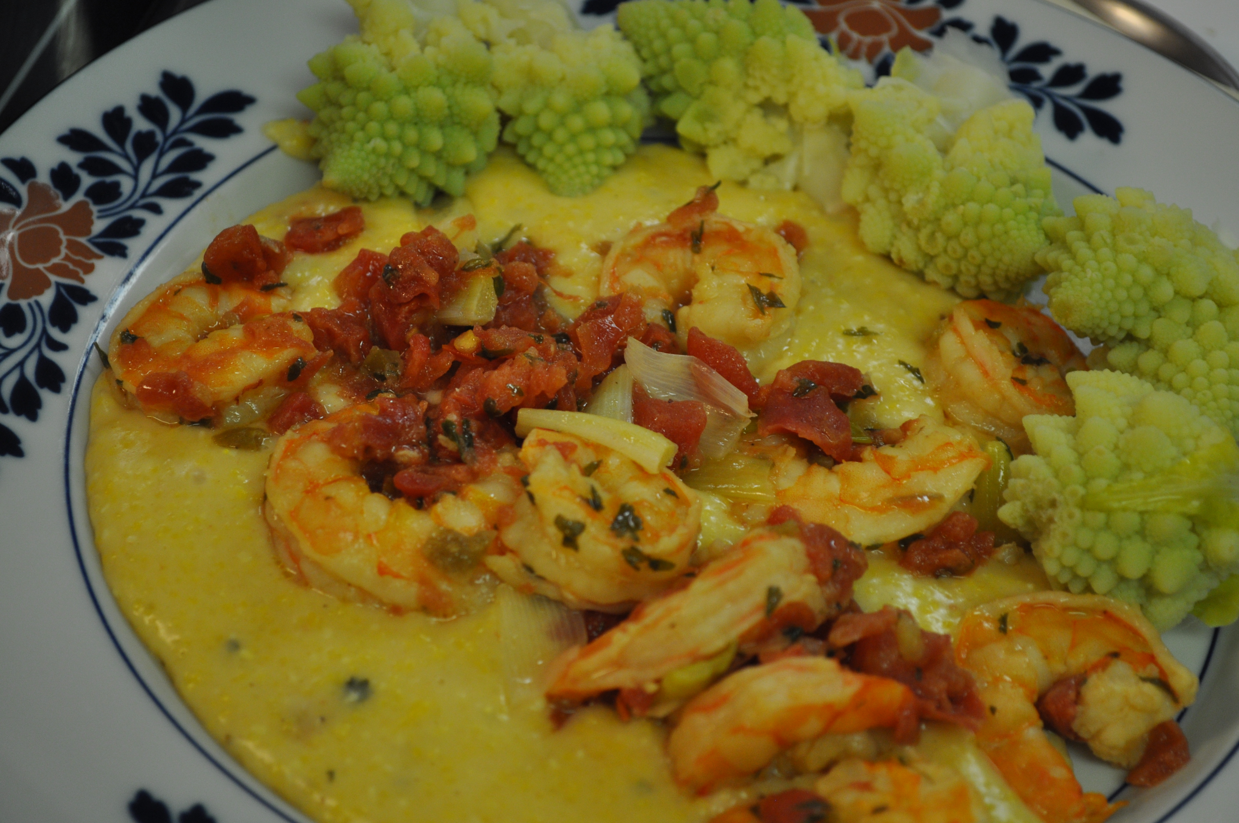 Milk, water, salt, boiled. Grits added. Then, I added the juice from my shrimp mix. As for the shrimp. Bought at Boarman’s in a 5 pound bag, Gulf shrimp. Divided into one pound portions and frozen. This one pound portion was steamed, then added to a can of Rotel tomatoes and chilies. A handful of scallions. It simmered away waiting for the grits.