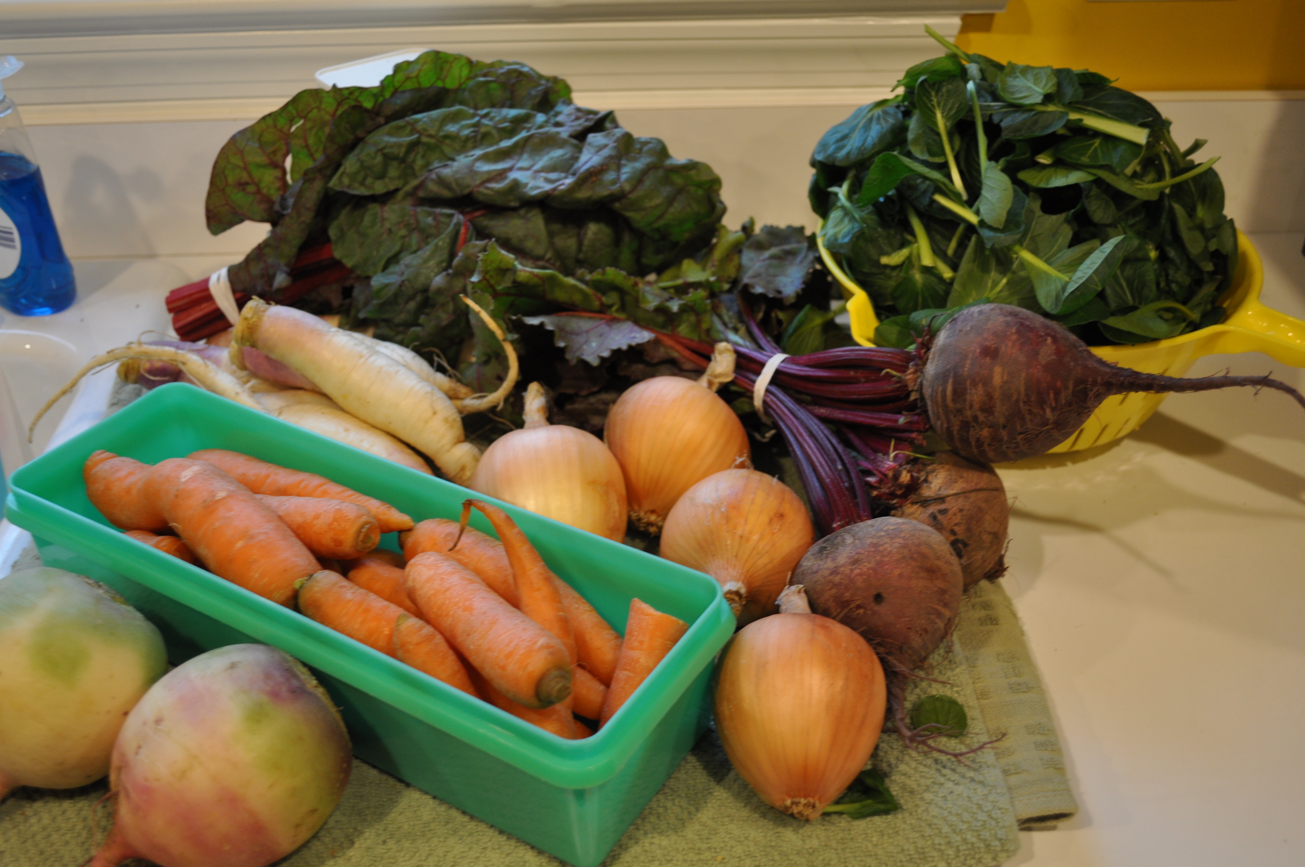 Looks good to me, for roughly $26 a share. All organic. About 10 pounds total. A couple of pounds of carrots. 12 ounces of tatsoi. Turnips. Chard. Red beets with their greens attached. Onions. Two absolutely lovely watermelon radishes.