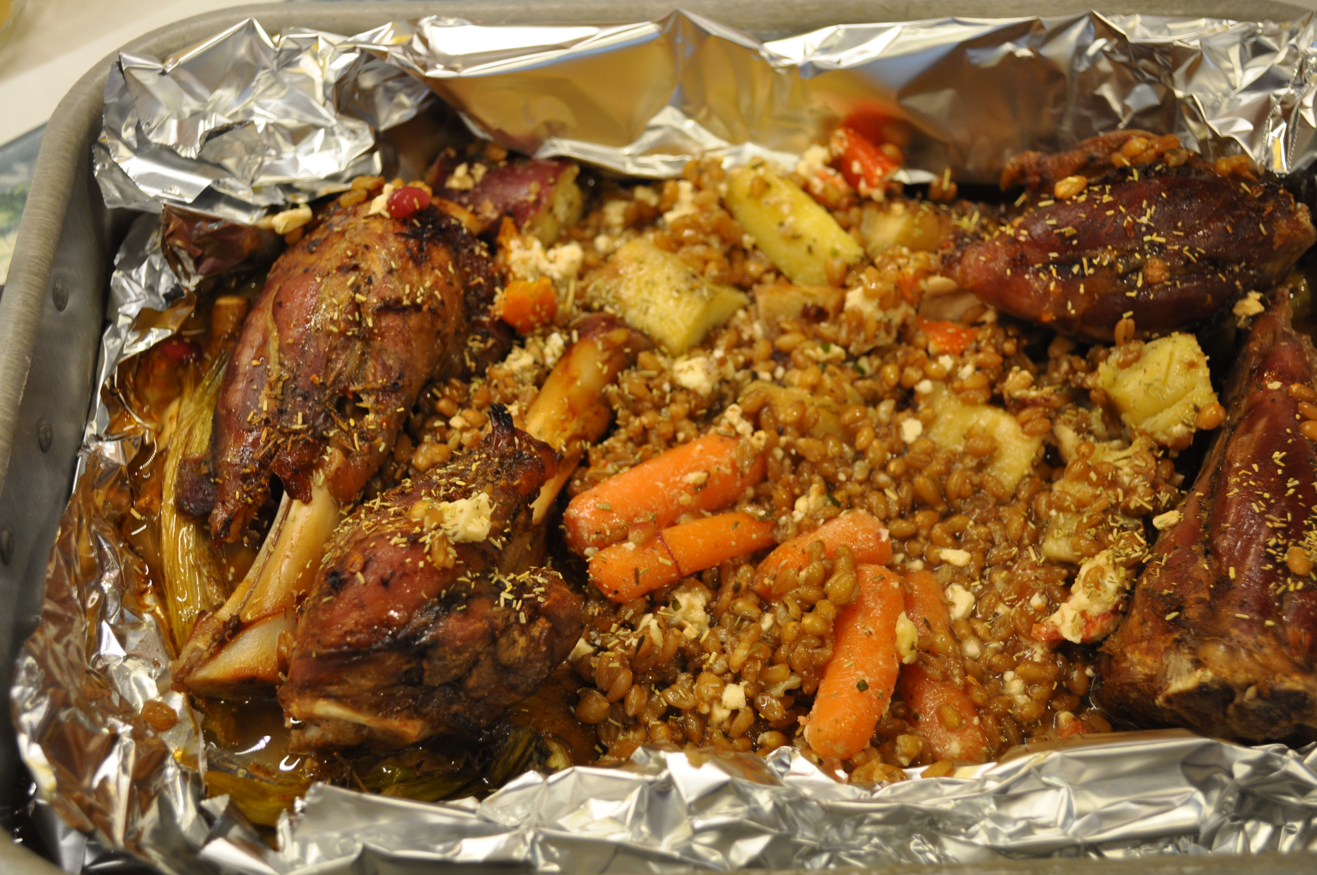 Lamb shanks with spelt berries, parsnips and carrots. It may not be pretty but it definitely tasted great.
