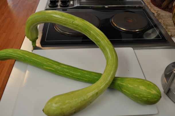 We have taken to calling them Italian squash, in order to get them accepted. They are the absolute best “zucchini-like” vegetable we grow. They get huge, but those long thin necks don’t contain seeds, which can be bitter. They slice and cook easily, and they also (for those of us with the utensils to do it) make wonderful fritters, breads, cakes, muffins, and more, when shredded. We have been getting dozens of these weekly, and they really do taste so much better than zucchini that have been left on the vine too long.