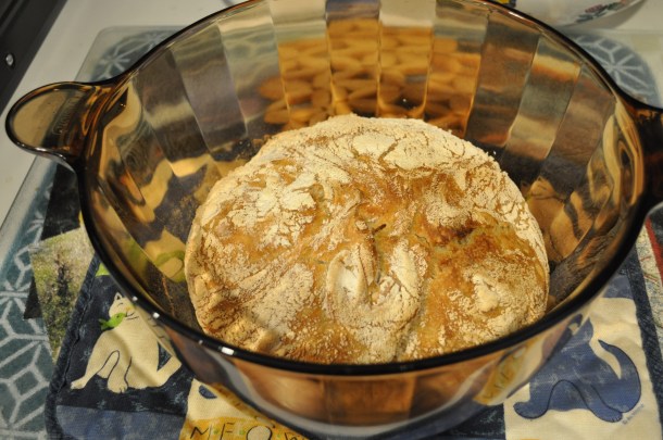 The directions call for you to use a heavy covered pot, like a Dutch oven. I used a Pyrex baking dish. It has to have a lid because what you are doing is creating an oven in your oven. The dish has to be preheated for a half hour at 475 degrees before dumping the dough from the towel into it. It will spread across the bottom. If you want a higher small boule, you need a pot that size.