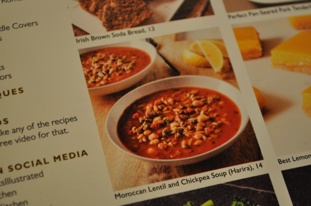 The latest Cooks Illustrated arrived with a almost vegetarian version of harira, a traditional dried legume and pasta soup with a boatload of spices. Many versions of this soup contain lamb, which would probably elevate it to a whole new level.