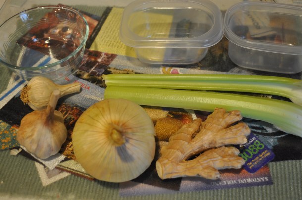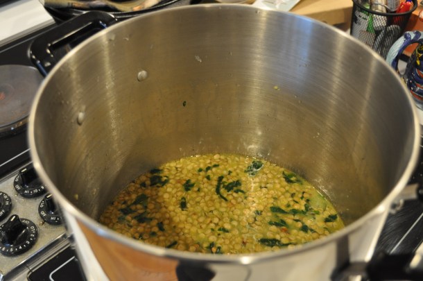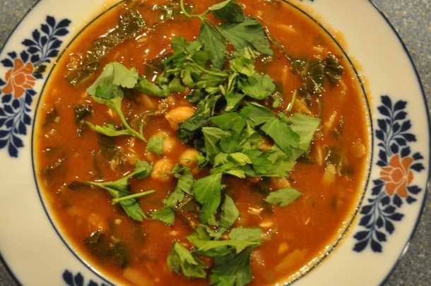 The soup begins with the onions, celery, garlic, ginger, some cilantro and parsley, the spices, the lentils and the chickpeas simmering away in a 50/50 mix of water and chicken stock. Not all that hard except for all the chopping and grating involved. Later, the container of strained tomatoes and the orzo get added with a slow simmer allowing the flavors to develop. Almost at the end, you add the greens. We didn’t have chard so we substituted collards.