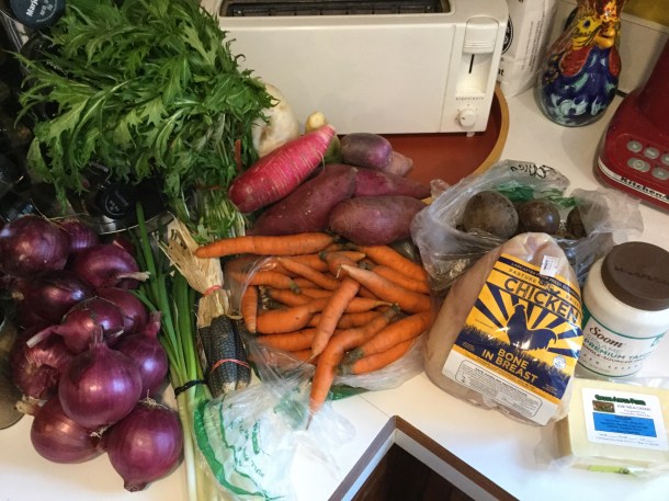 Here’s our first week’s basket. And what I did with it. With winter vegetables you may have them hanging around a while. Mine are stored mostly in cloth bags hanging in my garage or mud room. I can keep potatoes, turnips, onions, etc. for weeks as long as it is cool and dark.