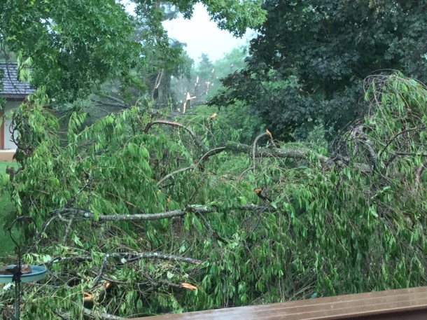 I should feel lucky. We were under it but it wasn’t on the ground. The chimney cap was ripped off. We lost one roof shingle. The satellite fin on my SUV was lifted and flung across the yard. Trees started breaking and falling in every direction.
