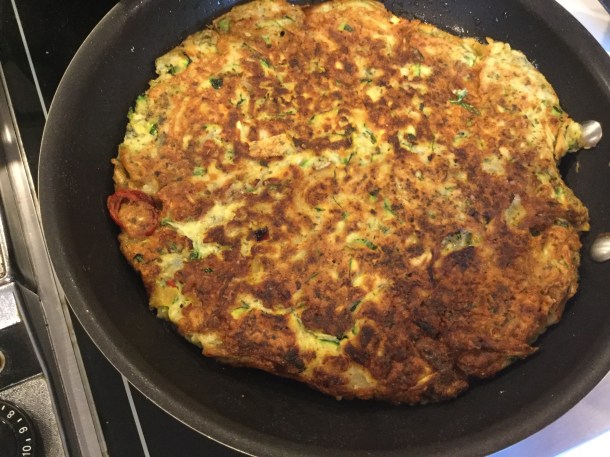 One giant zucchini fritter. I was too lazy to make little ones. This was an adaptation of Smitten Kitchen’s fritter with sweet red pepper in it.