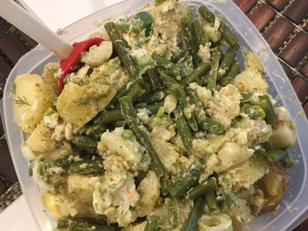 Loaded potato salad. With fresh green beans and baby red potatoes from our CSA. Fresh dill from my garden. Whole grain mustard.