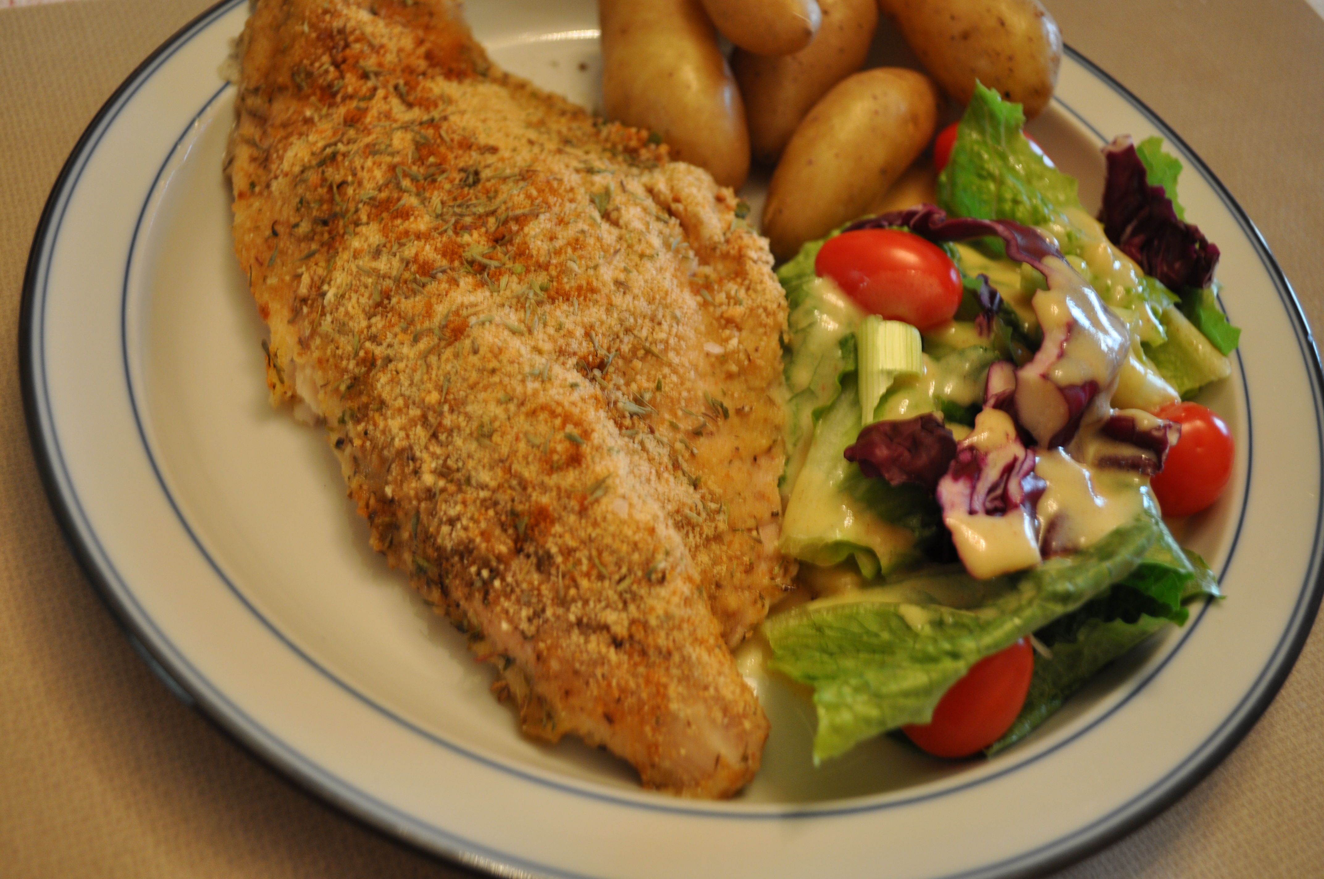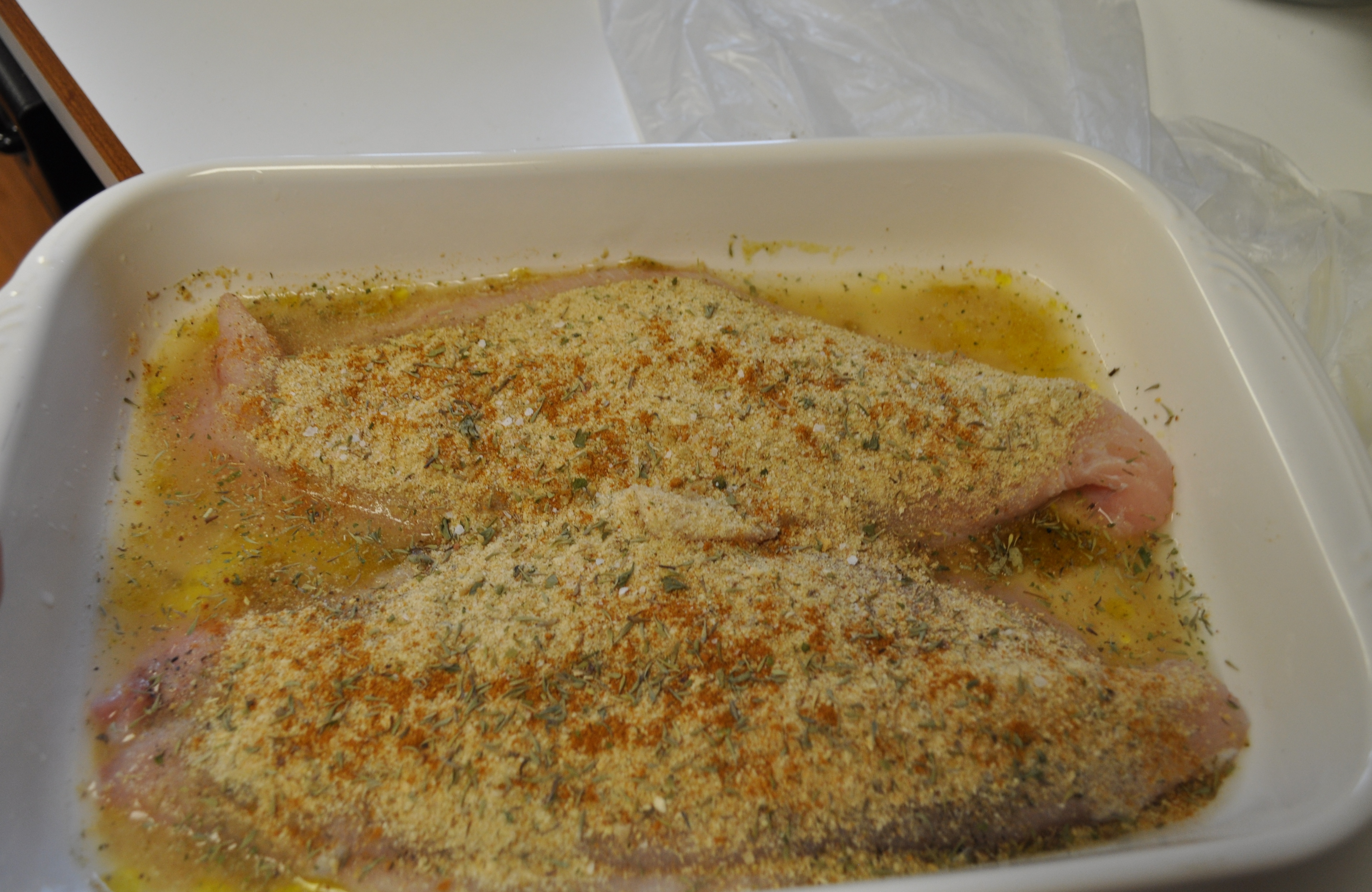 Ready to bake not that long after. A simple yet really flavorful preparation. A little olive oil in the pan. White wine. Lay the fish on top and sprinkle liberally with bread crumbs. Some paprika, thyme, salt and pepper. A final drizzle of Secolari’s lemon olive oil. Baked for 20 minutes at 300 degrees.