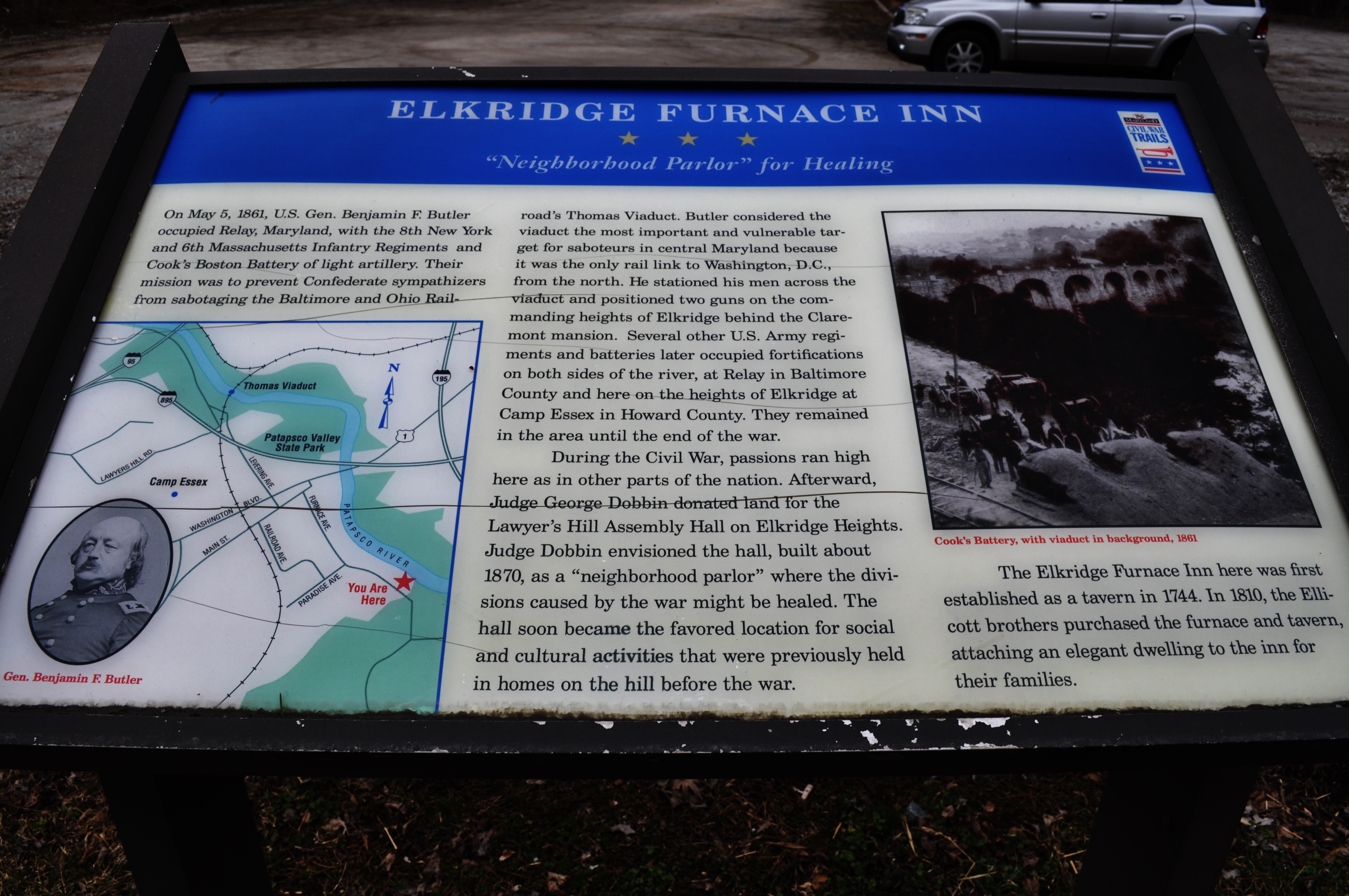 Further up just before crossing the Patapsco River into Baltimore County, turn right onto Levering Avenue to head back to the Elkridge Furnace Inn. Civil War History Marker just before the parking lot.