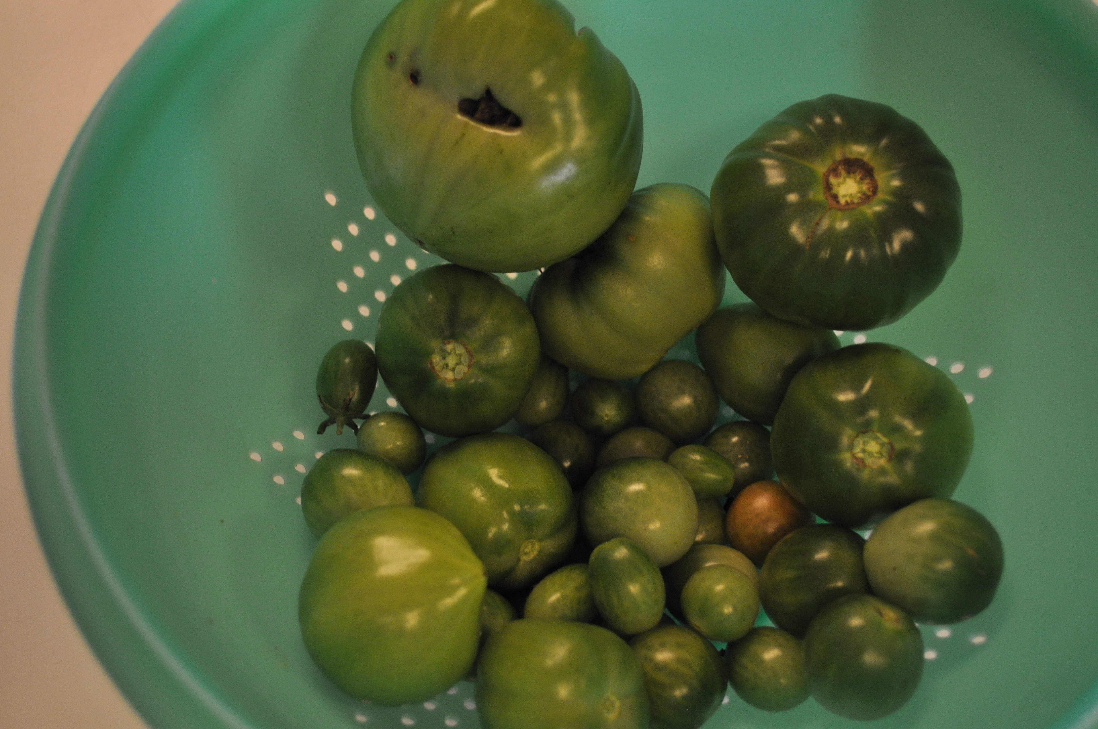 I think I will put these away in a paper bag and let them get close to ripening, then make one last batch of green tomato pasta with pesto.