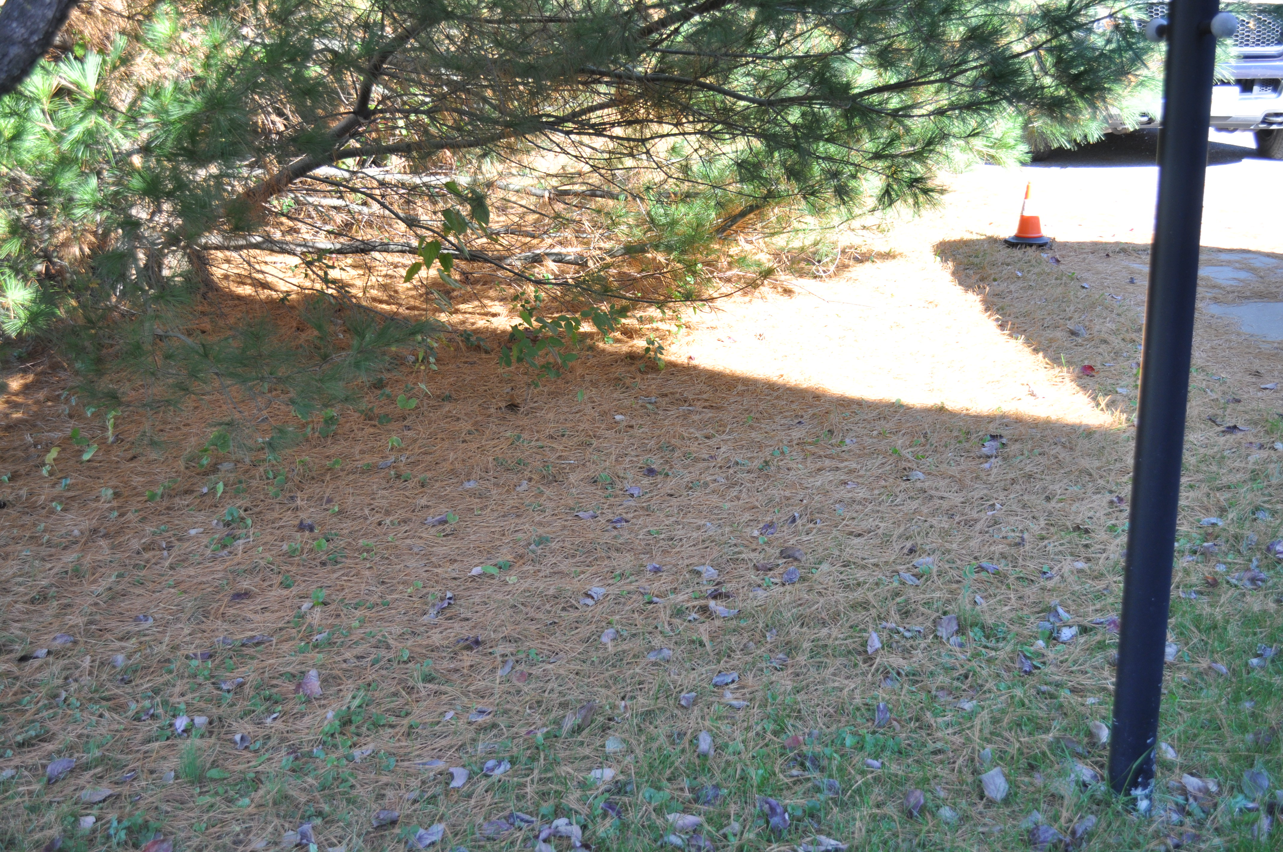 At least the first major clean up. We have been puttering around doing little odd jobs, but today it begins in earnest. I have been researching the long term effects of using pine needles to mulch areas of the plant beds in the back of the house. Today I wanted to gather pine needles to create a winter bed over the rhododendrons and the azaleas. This analysis that I found a while back is what prompted me to look into pine needle mulching in certain areas. We certainly have enough pine needles.