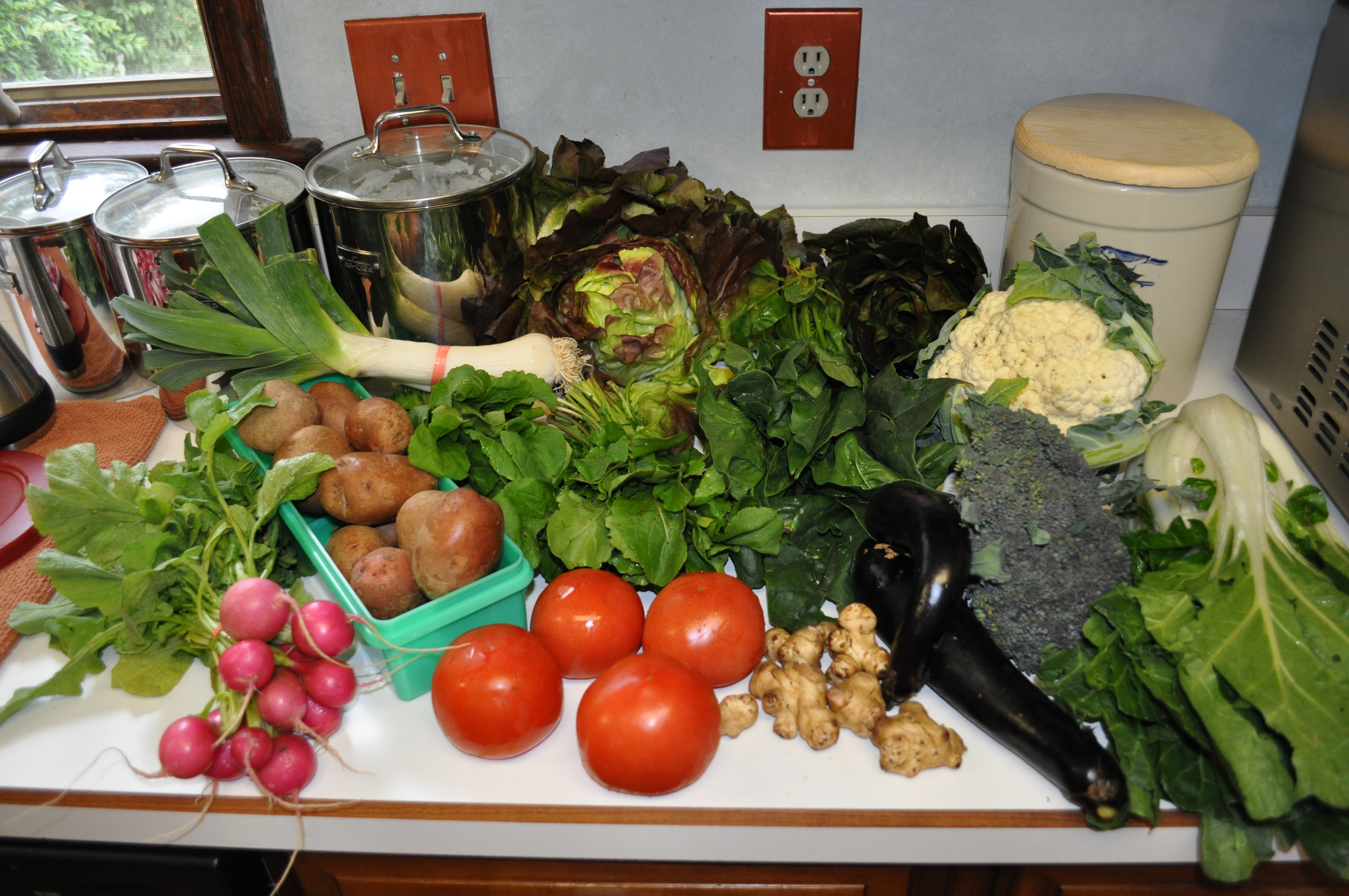 Dinners and lunches both highlight the CSA veggies. I now use a small notebook to determine the combinations I can make, to vary our meals and not waste any of the food.