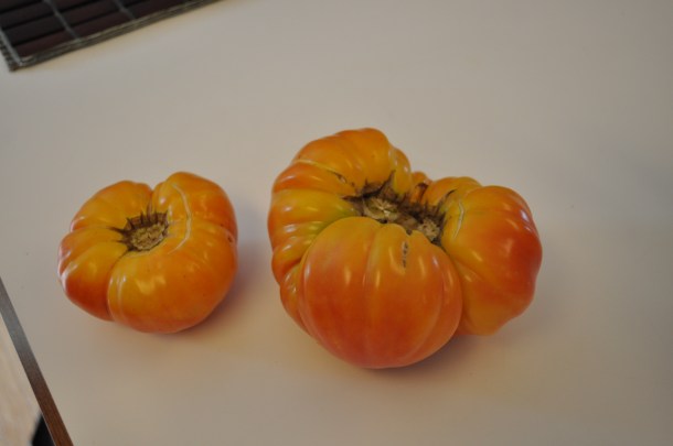 Getting back to recipes. We got a huge eggplant this week. Along with lots of lovely tomatoes, garlic, white peppers. This week’s eggplant dish may actually be a stacked version using the tomatoes and mozzarella I bought at Roots.