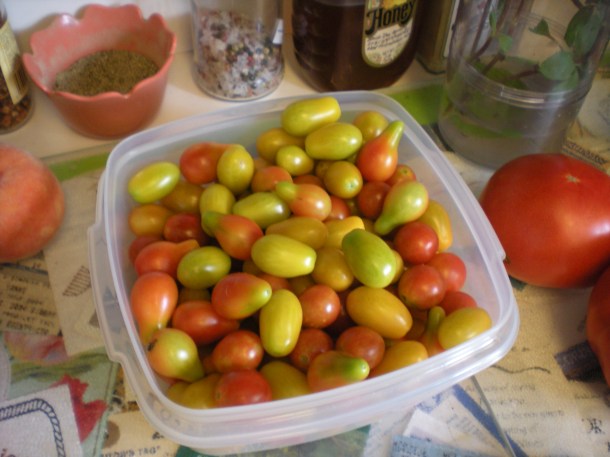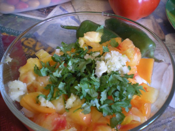 As for the chicken thighs, same sort of thing. Put olive oil, tomatoes, onions, peppers and chicken in a casserole, Covered the chicken in herbs, salt and pepper. Put it all in the oven on slow cook setting for three hours while doing chores around the house.