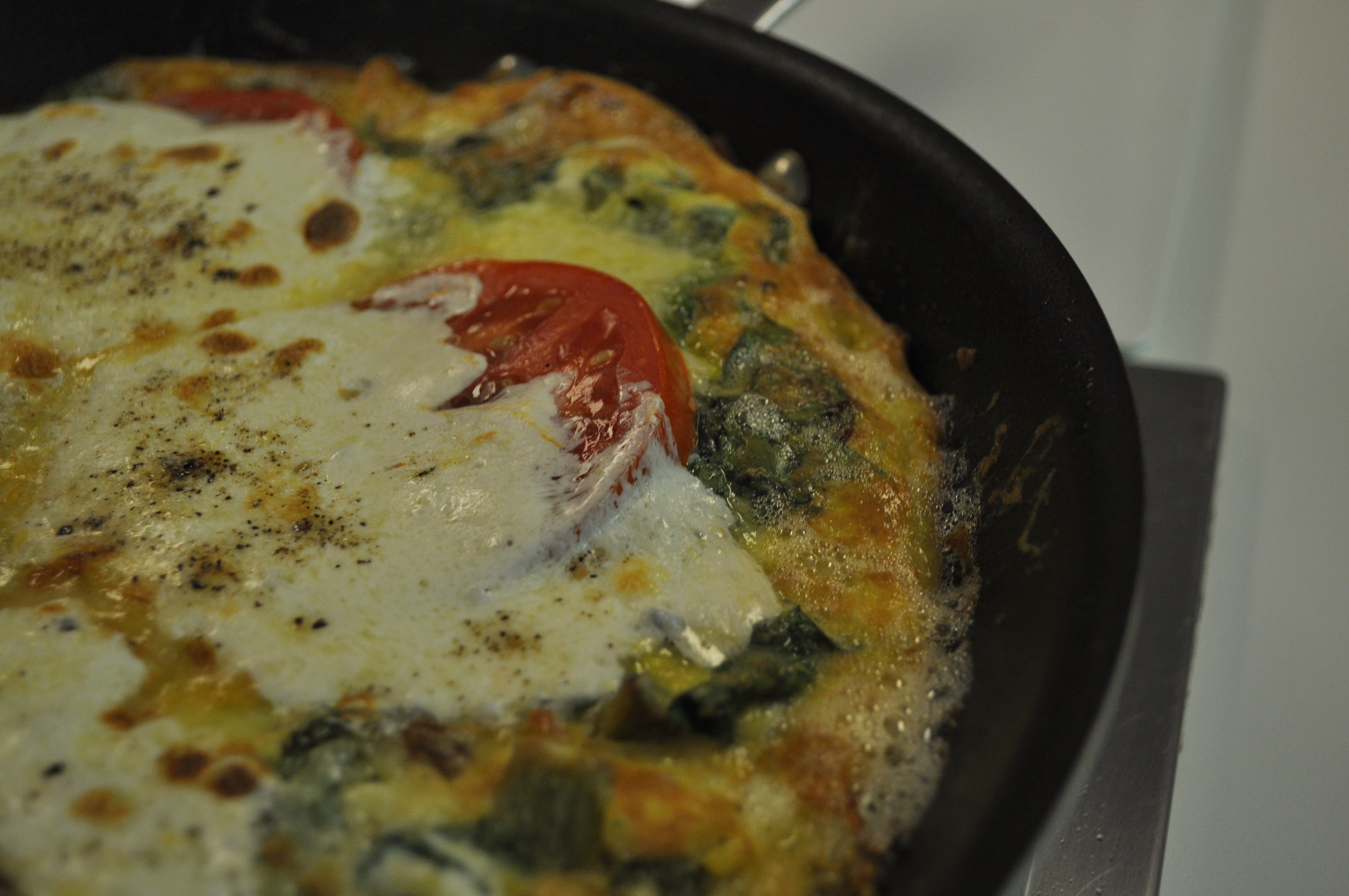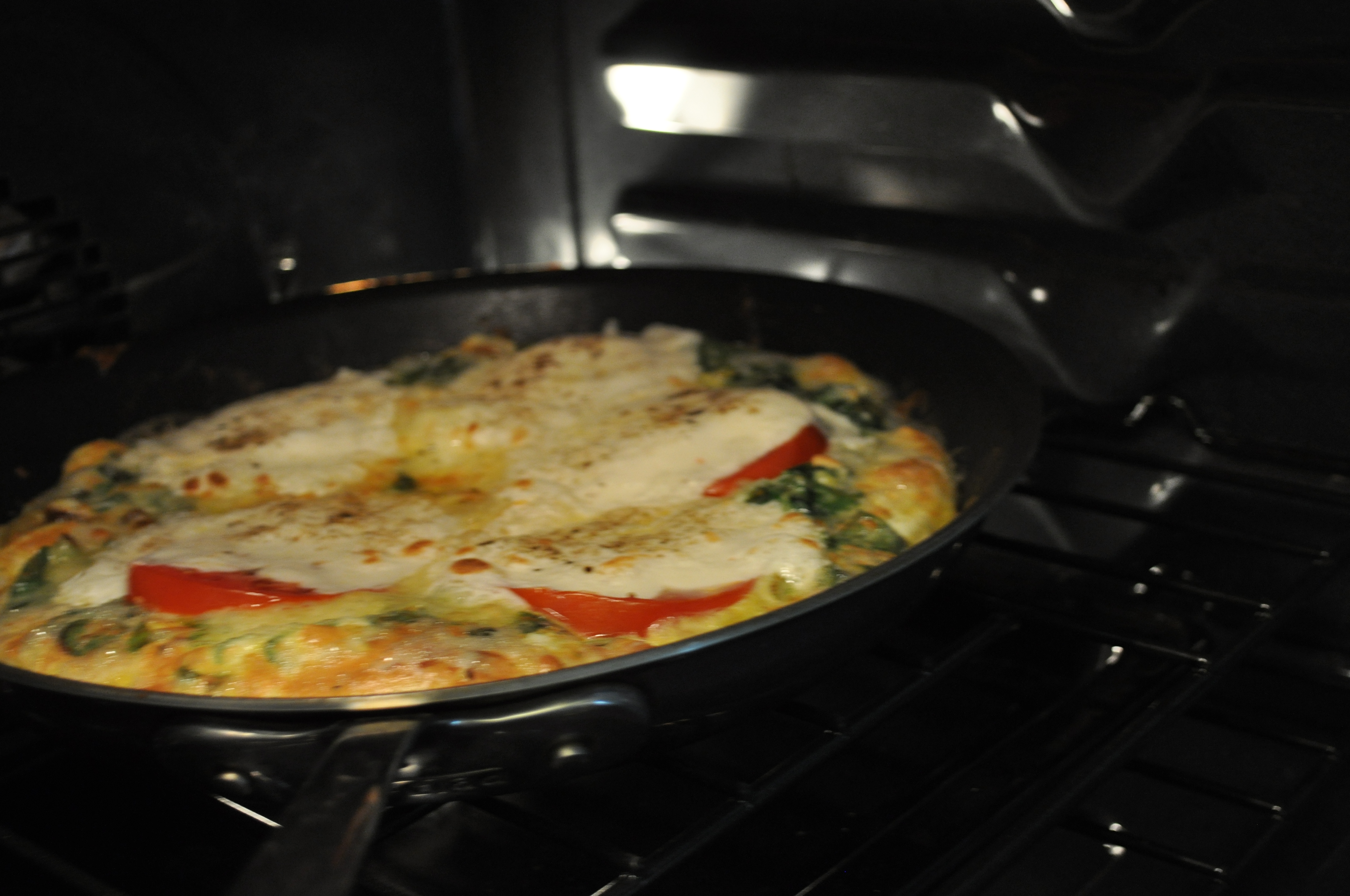 I picked up a couple of greenhouse tomatoes there, one of which ended up on top of the frittata, with thin slices of the South Mountain mozzarella. Under the broiler to melt the cheese, and finish the top of the frittata.